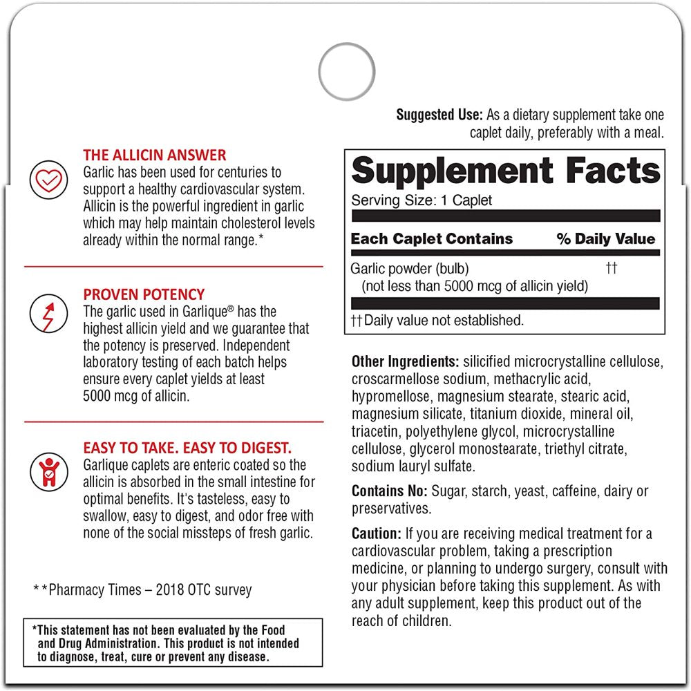 Pack of 4 for the UPC: 047046660003World leader in product potency.Dietary SupplementChattemActive Ingredients:Per Caplet: Garlic Powder (Bulb) (Not Less Than 5000 mcg of Allicin Yield); Silicified Microcrystalline Cellulose; Croscarmellose Sodium; Methacrylic Acid; Hypromellose; Magnesium Stearate; Stearic Acid; Magnesium Silicate; Titanium Dioxide; Mineral Oil; Triacetin; Polyethylene Glycol; Microcrystalline Cellulose; Glycerol Monostearate; Triethyl Citrate; Sodium Lauryl SulfateAs a dietary supplement take one caplet daily, preferably with a meal.Uses:Supports cardiovascular health.* Cardiovascular support: Garlic has been used for centuries to support a healthy cardiovascular system. Garlic contains alliin and allinase, which combine to produce allicin - the ingredient in garlic that most scientists believe is responsible for providing support for cardiovascular health and helping to maintain cholesterol levels already within the normal range.* A world leader in product potency: Allicin yield, the amount of allicin that can be produced when the alliin and allinase in garlic combine, is an important measure of garlic's potency and effectiveness. The garlic used in GARLIQUE has the very highest allicin yield and is processed with extreme care and attention, guaranteeing that the potency is preserved. Independent laboratory testing helps ensure that each new GARLIQUE caplet yields at least 5000 mcg of allicin faster than before, which means that more is available to the body sooner. Odor-free: GARLIQUE caplets are enteric coated (absorbed in the small intestine, not in the stomach), odor-free, tasteless, easy to swallow and easy to digest. GARLIQUE has none of the unsocial qualities associated with fresh garlic cloves. One per day: New GARLIQUE caplets are easier to swallow and so convenient that you take only one caplet per day to support cardiovascular health.* Contains No: Sugar, starch, yeast, caffeine, dairy or preservatives.If you are receiving medical treatment for a cardiovascular problem, taking a prescription medicine, or planning to undergo surgery, advise your physician you are taking this supplement. As with any adult supplement, keep this product out of the reach of children. *This product is not intended to diagnose, treat, cure or prevent any disease.