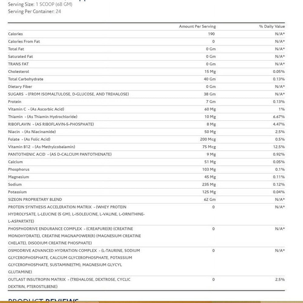 Accelerate Protein Synthesis & Muscle Force RecoveryIncrease Muscle Volume, Muscle Fiber Size, Cell Volume & Plasma Amino Acid LevelsAmplify S6K1 and 4E-BP1 Signaling and Hypertrophic mTOR Pathway ConductionInitiate & Sustain Myogenes and Muscle Recover While You Are Still TrainingDeliver Vital Nutrients, Essential Minerals, and Growth Cofactors To Skeletal Muscle TissueHarnesses the Insulinotropic Power of PterostibeneIncludes the never before seen LOLA?, cutting -edge, amino acid salt L-Ornithine-L-AspartatePowerful Intra/Post Lean Mass and Strength Increasing Creatine FormulaGaspari took Sports Nutrition to the highest level with SizeOn, the original intra-workout creatine drink. As clinical research advances, so does Gaspari Nutrition which is why SizeOn has now evolved into the Ultimate Hybrid Intra-Workout Whey Hydosylate Creatine Formula. SizeOn now uses a high quality whey hydrosylate that contains over 50% di and tripeptides as well as a large array of promoting ingredients such as a high dose of L-LEUCINE (5 grams) to allow for unparalleled increases in athletic performance, skeletal muscle recovery, explosiveness and most notably, immediate increases in muscle size WHILE YOU ARE STILL TRAINING. Furthermore Gaspari Nutrition researchers have harnessed the power of pterostilbene our patent pending and brand new insulin secretagogue - picked specifically to work in concert with our universally acclaimed and patent pending Outlast? carbohydrate blend. This powerful combination initiates and sustains muscle volumization to levels never seen before in a sports nutrition product. To top it off, we also included LOLA?, our cutting-edge, ammonia scavenging amino acid salt of L-Ornithine and L-Aspartate to help battle fatigue. The bottom line is that Gaspari Nutrition has once again outdone itself and yet again redefined what an intra-workout supplement should be a category of product we created years ago! Directions SizeOn is meant to be taken on training days WHILE you train. Mix one scoop in 20-30 ounce of cold water and sip throughout your workout. Should the need arise, add more water as necessary throughout your workout for proper hydration. Disclaimer These statements have not been evaluated by the FDA. These products are not intended to diagnose, treat, cure, or prevent any disease.