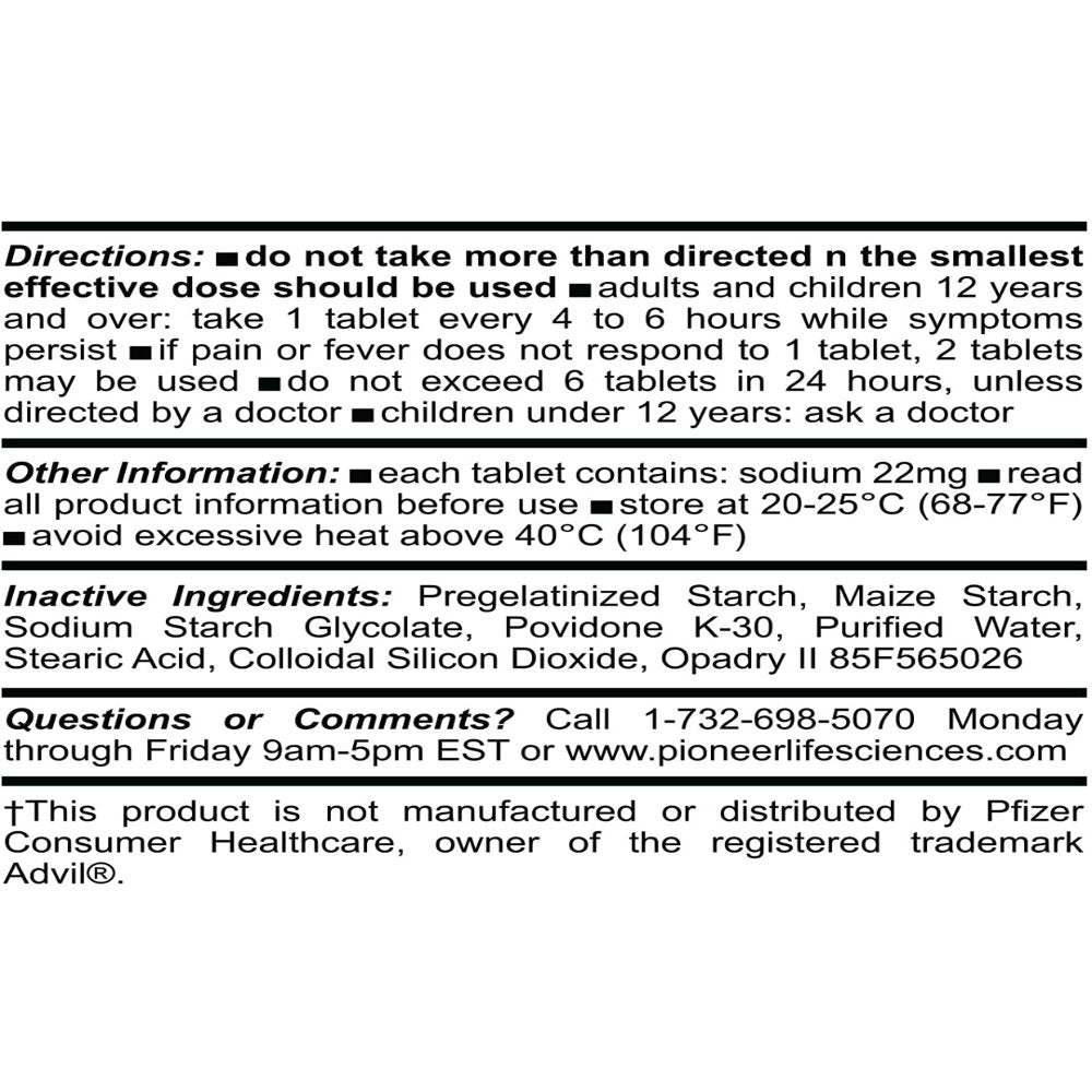 Each coated tablet contains 200 mg of Ibuprofen for temporary relief of headaches, body pain, cramps, tooth aches, muscular pain, and minor pain due to arthritis.