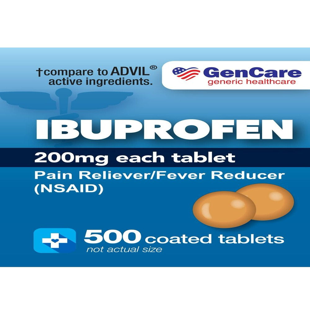 Gencare - Ibuprofen (200Mg) Pain Reliever and Fever Reducer (500 Coated Tablets) | Ultimate Savings Bulk Pack | NSAID for Headache Relief, Body Aches, Back Pain, Cramps, Muscle Aches & Arthritis