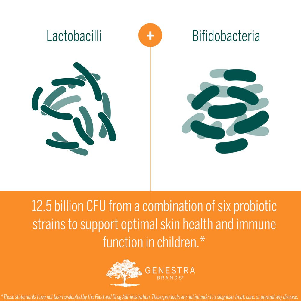 HMF Child probiotic formula is a great tasting and unique combination of probiotics, including Lactobacillus acidophilus, Bifidobacterium bifidum, Lactobacillus paracasei, Lactobacillus salivarius, and Bifidobacterium animalis subsp. lactis, which help maintain a child's healthy gut flora. Bifidobacterium bifidum and Lactobacillus lactis are found in the intestinal flora of healthy children. Probiotics influence the intestinal microbiota, modulate the immune response, and support optimal skin health.