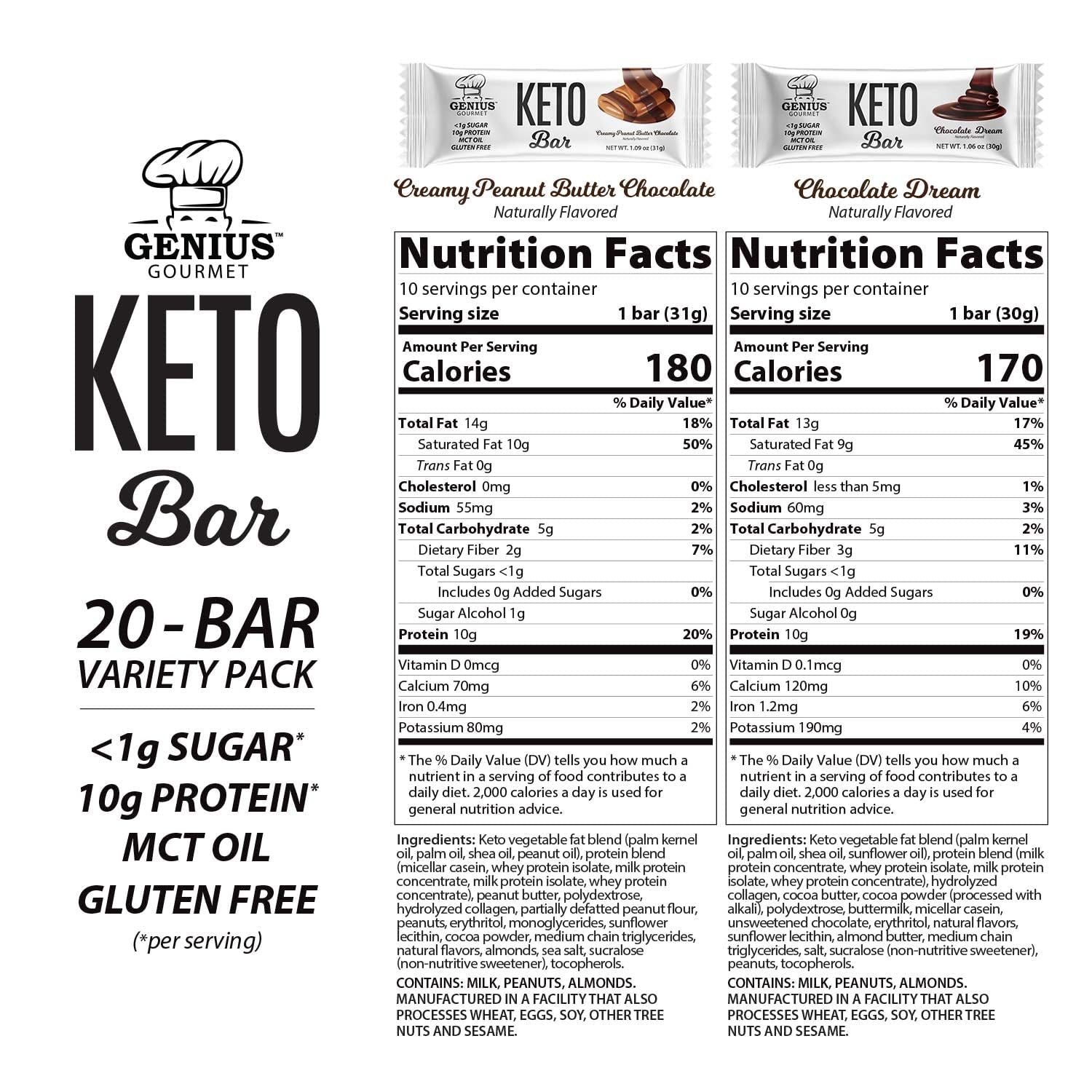 Genius Gourmet Gluten Free Keto Protein Bar, Chocolate Keto Bars, Premium Mcts, Low Carb, Low Sugar (Variety Pack, 20 Count (Pack of 1))