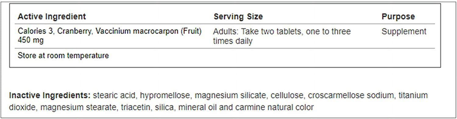 *Active Ingredient: Calories 3, Cranberry, Vaccinium macrocarpon (Fruit) 450 mg
