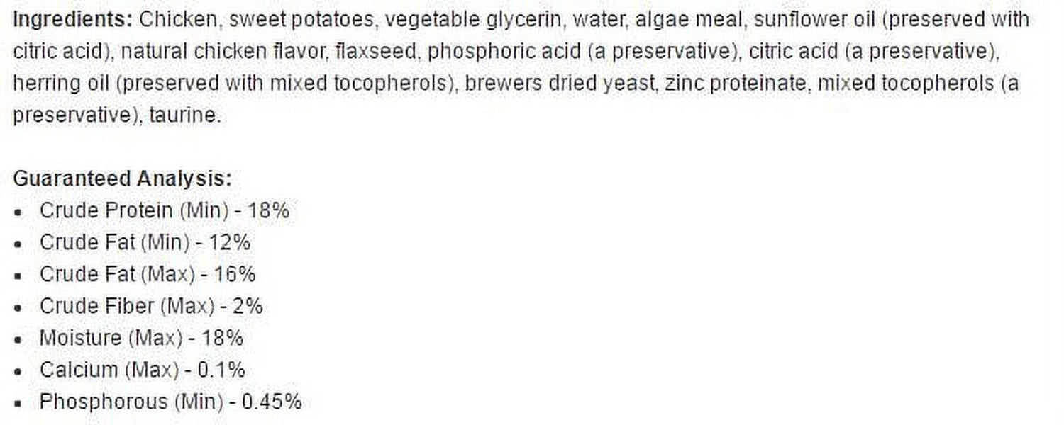 Get Naked Kitten Health Treats are soft, semi-moist treats for young kittens that are fortified with DHA for cognitive development. These delicious treats are made with real chicken and are wheat, corn, soy and petroleum free.Fortified with DHA for cognitive healthMade with real chicken and no wheat, soy, corn or petroleumContains Omega 3 and 6 for skin and coat healthWith less than 3 calories per treat and DHA Gold that aids cognitive health, Get Naked Kitten Health is a nutritious treat your kitten will love!.Guaranteed Analysis:Crude Protein (min) - 15.0%Crude Fat (min) - 14.0%Crude Fiber (max) - 2.0%Moisture (max) - 18.0%