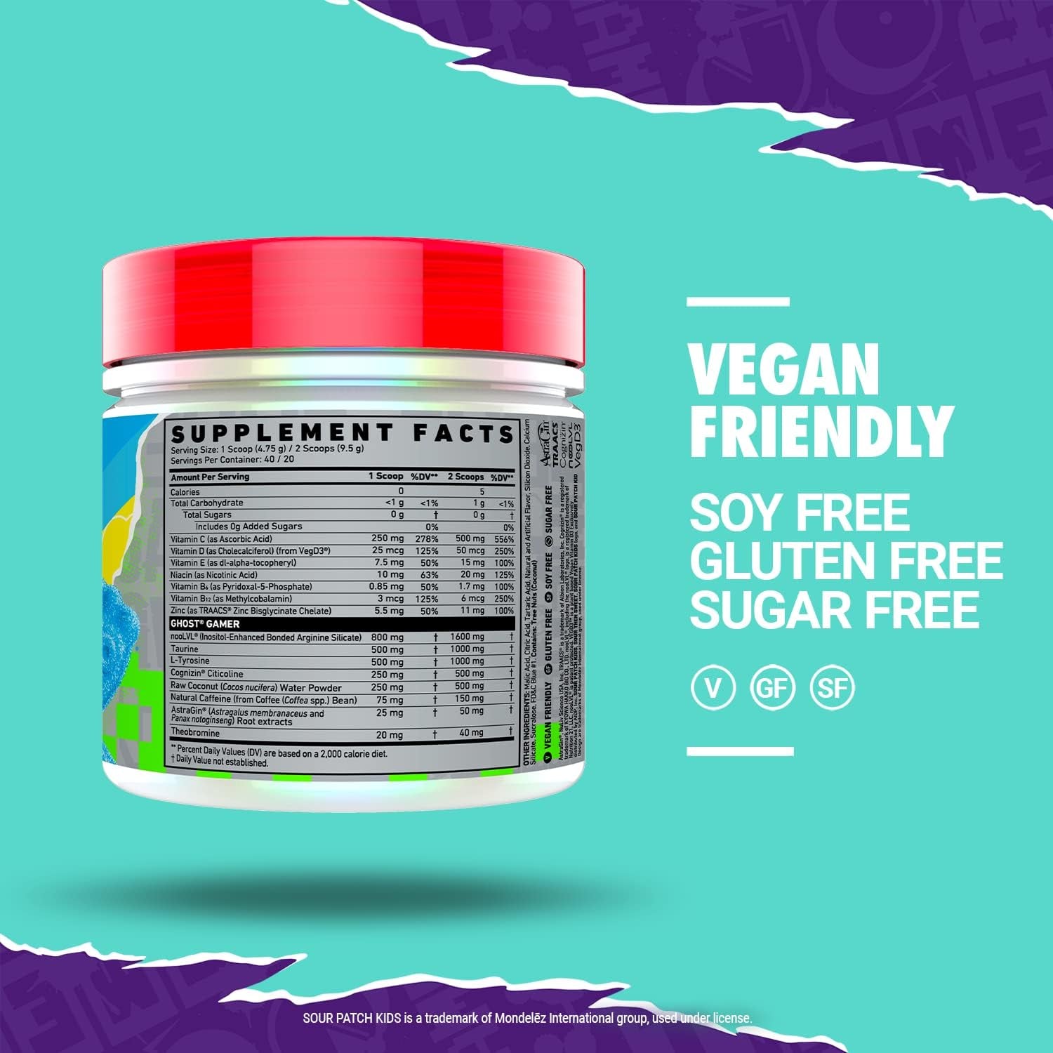 - Game On: GHOST Gamer is the perfect combo of nootropics and natural energy to ensure you’re dialed in for an afternoon on the sticks or at the office. Delivered in true GHOST form with sick design, a fully transparent formula, and epic Sour Patch Kids Blue Raspberry flavor. 40 servings.