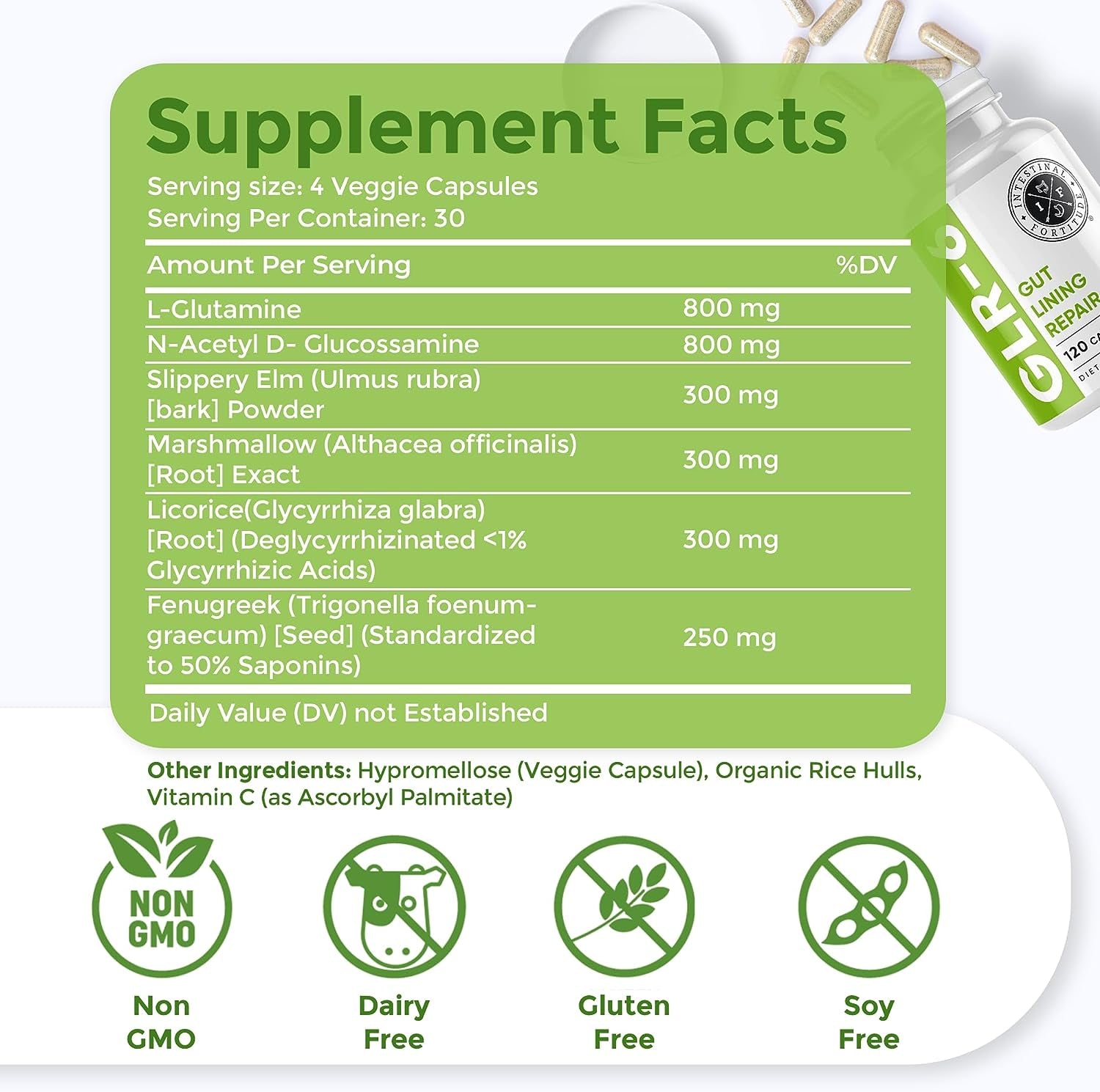Marshmallow root, slippery elm, and fenugreek are natural ingredients known for their soothing properties and ability to lower the gastrointestinal tract, while DGL licorice root can protect and heal the mucosal lining, and L-glutamine and N-acetyl-D-glucosamine aid in the maintenance, repair, and integrity of the intestinal lining to improve gut health and function.