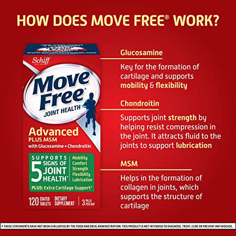 This joint support supplement contains Glucosamine, Chondroitin, Hyaluronic Acid, Uniflex and MSM to help support the 5 signs of joint health!* Move Free Advanced contains UNIFLEX which is a clinically tested mineral complex that supports joint comfort in as little as 2 weeks.* Methylsulfonylmethane (MSM) is a source of sulfur found in the body that is important in the formation of collagen in joints. Collagen is a vital part of your joints because it supports the structure of cartilage.* Move Free Advanced supports G3, PLUS it provides extra cartilage support.* DIRECTIONS: Adults take three (3) tablets once a day with a meal OR one (1) tablet three times daily with meals. This products contains a 40 day supply and is FSA eligible. The MOVE FREE product family with clinically tested ingredients, offers a range of solutions to help you move better. Because when you MOVE FREE-ly, you live freely. *These statements have not been evaluated by the Food and Drug Administration. This product is not intended to diagnose, treat, cure or prevent any disease.