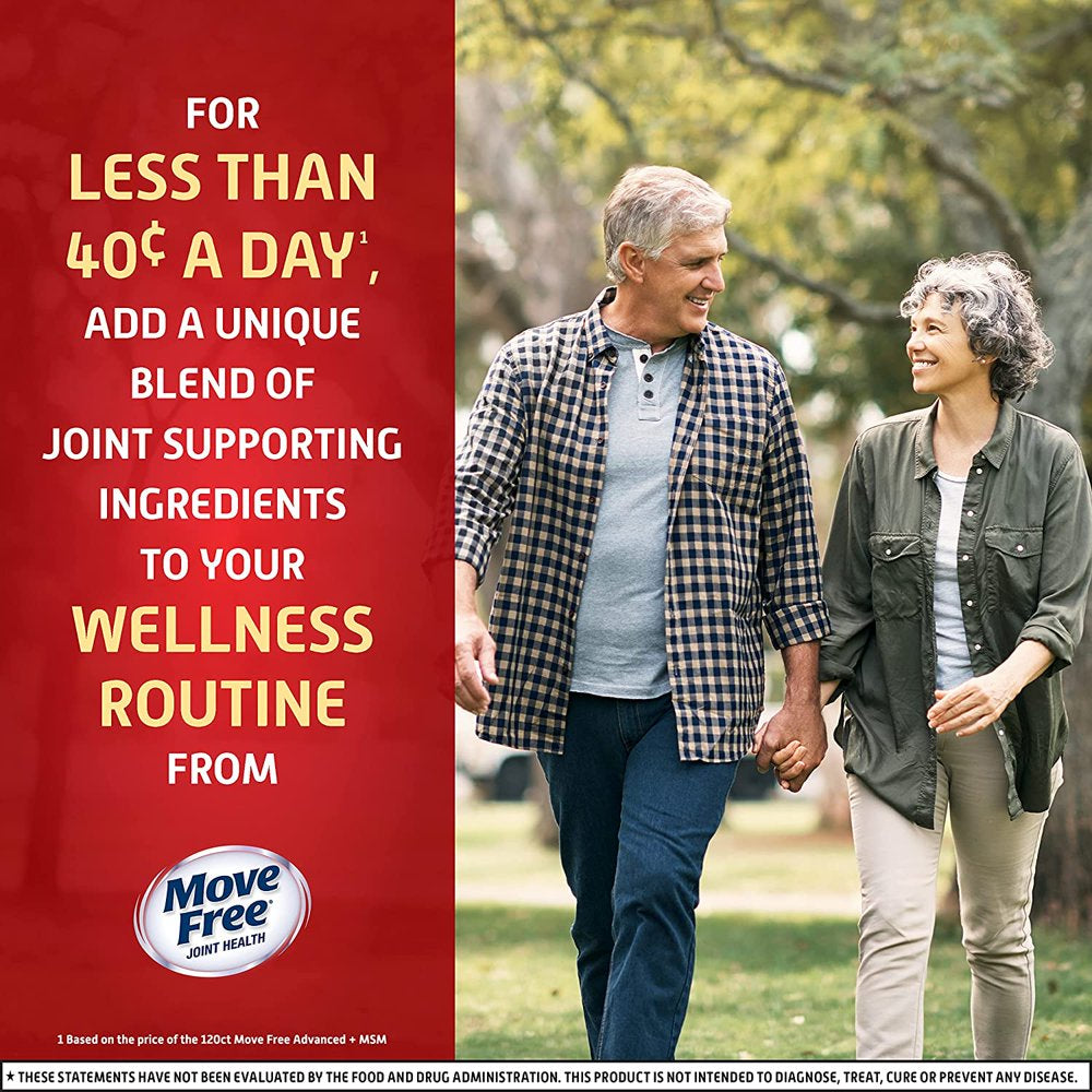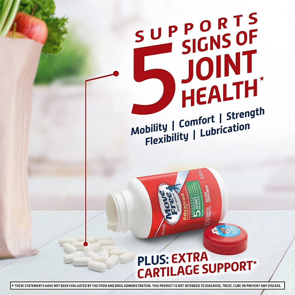 ADVANCED JOINT SUPPORT FOR MEN & WOMEN: This joint support supplement contains Glucosamine, Chondroitin, Hyaluronic Acid, Uniflex and MSM to help support the 5 signs of joint health!* JOINT COMFORT: Move Free Advanced contains UNIFLEX which is a clinically tested mineral complex that supports joint comfort in as little as 2 weeks.* EXTRA CARTILAGE SUPPORT: Methylsulfonylmethane (MSM) is a source of sulfur found in the body that is important in the formation of collagen in joints. Collagen is a vital part of your joints because it supports the structure of cartilage.* SUPPORTS 5 SIGNS OF JOINT HEALTH: Move Free Advanced supports G3, PLUS it provides extra cartilage support.* DIRECTIONS: Adults take three (3) tablets once a day with a meal OR one (1) tablet three times daily with meals. This products contains a 40 day supply and is FSA eligible. DEVELOPED BY SCIENTISTS: The MOVE FREE product family with clinically tested ingredients, offers a range of solutions to help you move better. Because when you MOVE FREE-ly, you live freely.