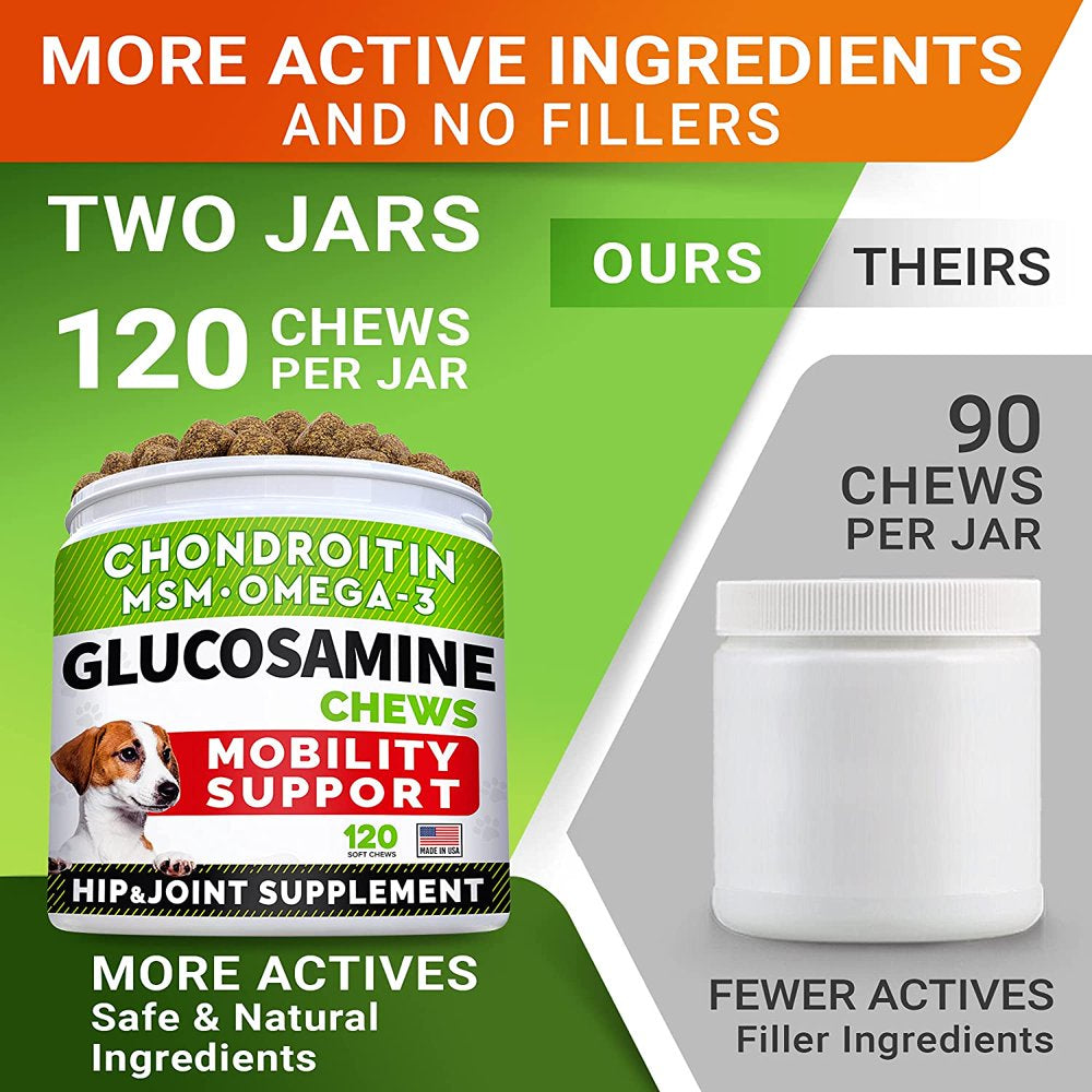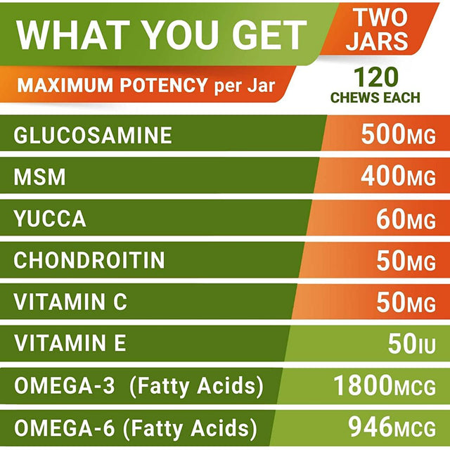 Keep your Dog in Good Health, Active and Super Energetic with this Premium Quality Glucosamine Chondroitin for Dogs Hip and Joint Supplement This natural chewables is formulated with combination of all essential ingredients to provide extend care for joints: Glucosamine for dogs hip and joint supplement with MSM, Chondroitin Sulfate, Yucca Schidigera Extract, Omeg-3 Fish Oil, Calcium and Vitamins When used regularly, joints treatibles for dogs will have the following effects: PAIN RELIEF SUPPLEMENT: helps with inflammation, stiffness and pain releaf. DOG SUPPLEMENTS FOR JOINTS AND HIPS: helps cushion and lubricate joints, promotes health joint structure and functioning, improves bones strength. INCREASE MOBILITY FOR SENIORS DOGS: helps with joint pain, improves general mobility and energy. POST-SURGERY RECOVERY: anti-inflammatory properties help with swelling, pain, stiffness, recovers from sprains, strains and broken bones. SYNERGISTIC BENEFITS: can be used in conjunction with regular medications with no interactions. NO SIDE EFFECTS: does not damage the liver, kidney or GI tract. DIETARY SUPPLEMENT: can be administered daily as part of your doggie's diet.. These soft chews for dogs are Made in USA, following strict quality standards, with all natural component for best possible product, to ensure the wellness of your pup from paw and tail to nose and ears. Joint chews for dogs are suitable for all ages, from puppy to older senior dogs, any breed from yorkies to large labs.