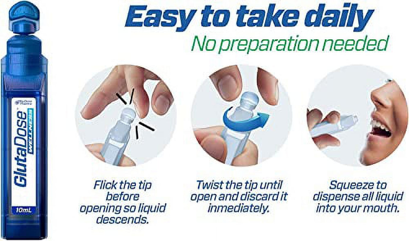 - THE GLUTADOSE WELLNESS IS EASY TO TAKE - Simply open the plastic vial and the First Day: Take 2 vials, one before breakfast and one before dinner. Subsequent Days: Take 1 single-dose vial daily, before breakfast. Simply open the vial and dispense, and hold the liquid in your mouth for 15 seconds, then swallow.