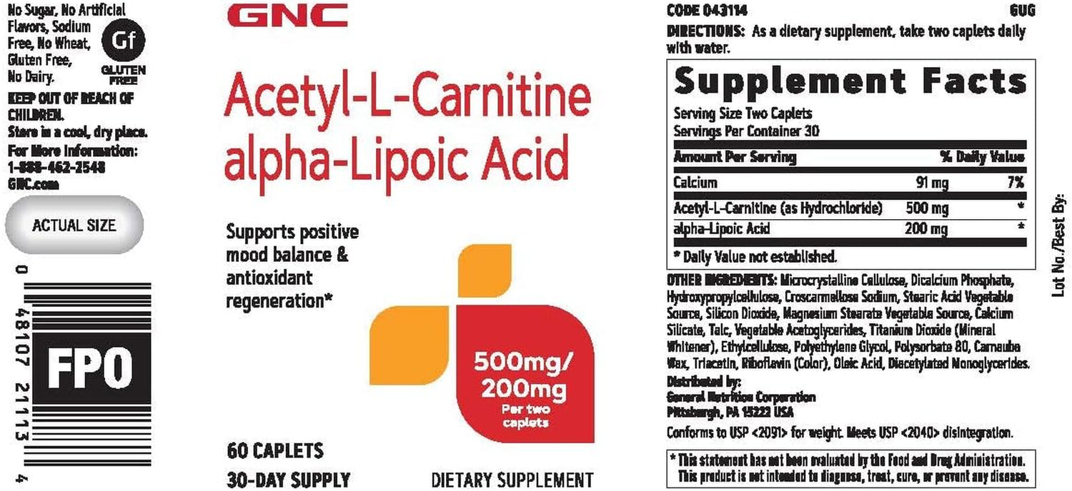 GNC Acetyl-L-Carnitine alpha-Lipoic Acid 500mg/200 mg Provides 500mg Acetyl-L-Carnitine, and 200mg alpha-Lipoic Acid per serving Supports positive mood balance and antioxidant regeneration.* Gluten free, no sugar, no artifical flavors, sodium free, no wheat, no dairy 60 caplets per container These statements have not been evaluated by the Food & Drug Administration. This product is not intended to diagnose, treat, cure, or prevent any disease.