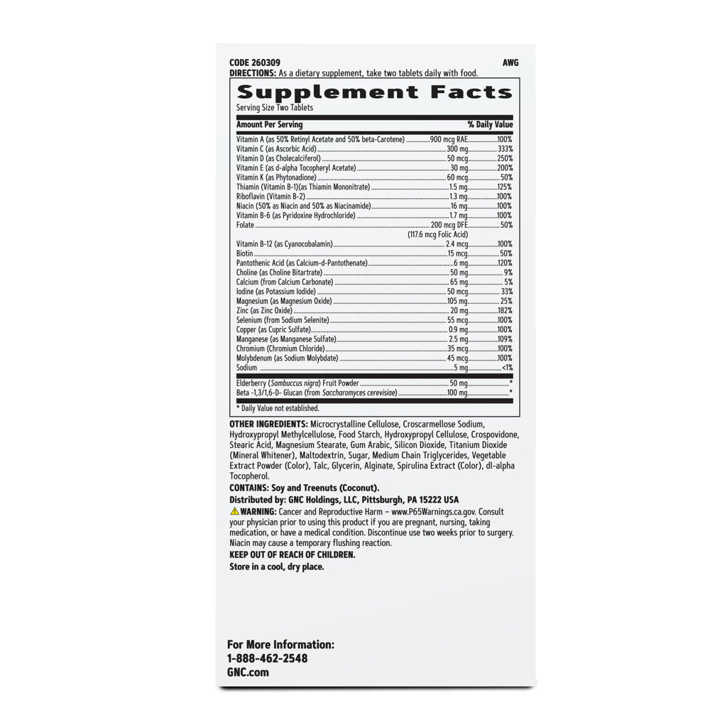 GNC Multivitamin + Immune is a premium 2-in-1 solution that combines a multivitamin with key immune support ingredients for everyday health and wellness*. Features 26 ingredients, including 16 vitamins and minerals at 100% daily value or higher for everyday health and wellness customized with enhanced levels of vitamin C, vitamin D-3 and zinc plus Sambucus Elderberry & Beta-Glucan for advanced immune support*.