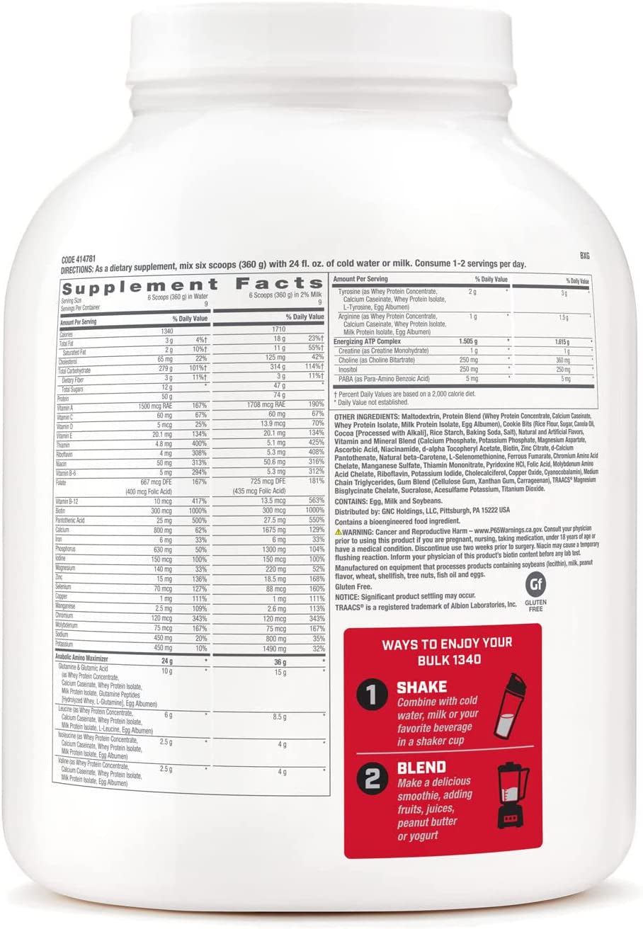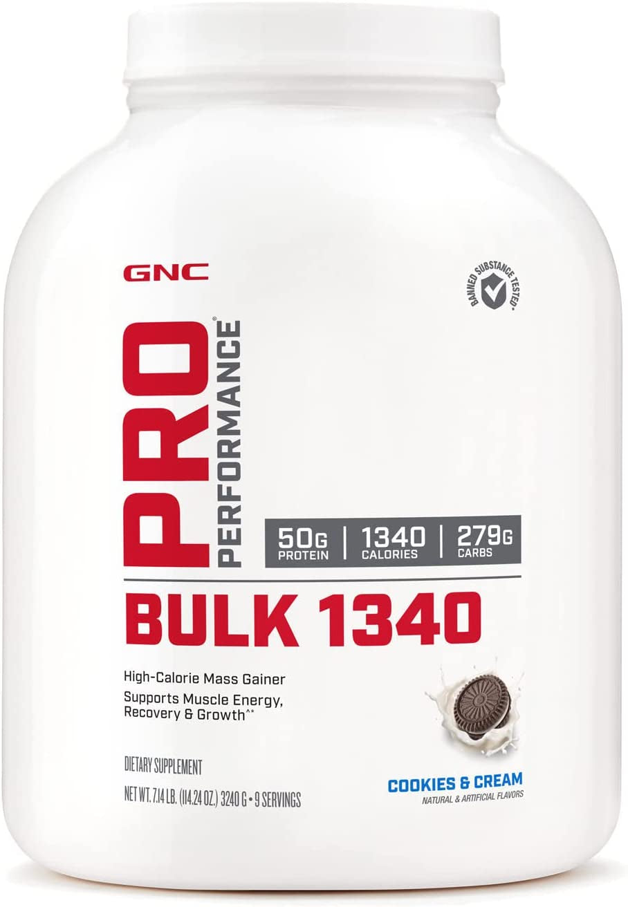 - HIGH-CALORIE MASS GAINER: GNC Pro Performance Bulk 1340 is a scientifically formulated mass gainer that delivers 1,340 calories per serving and 50g of high-quality protein to help you increase size and overall strength when used in conjunction with an exercise program.