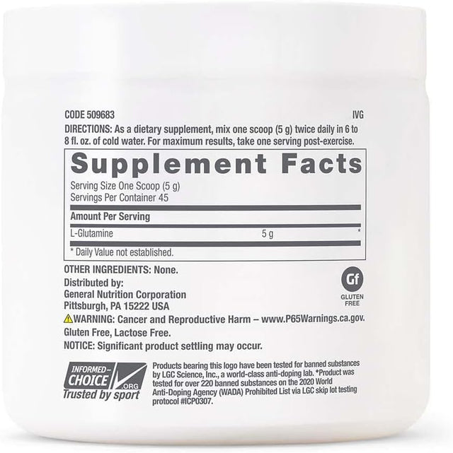 GNC Pro Performance L-Glutamine 5000 mg GNC Pro Performance L-Glutamine is a key amino acid for muscles. Supplementation may help maintain glutamine levels that have been depleted as a result of intense exercise. Glutamine is involved in protein synthesis and plays a pivotal role in the body's nitrogen balance.ˆ It serves as a fuel for the immune system and maintenance of proper intestinal function. Tested and certified Banned Substance Free♦ Gluten and lactose free Mixes easily with your favorite beverage. ˆWhen used in conjunction with an exercise program.