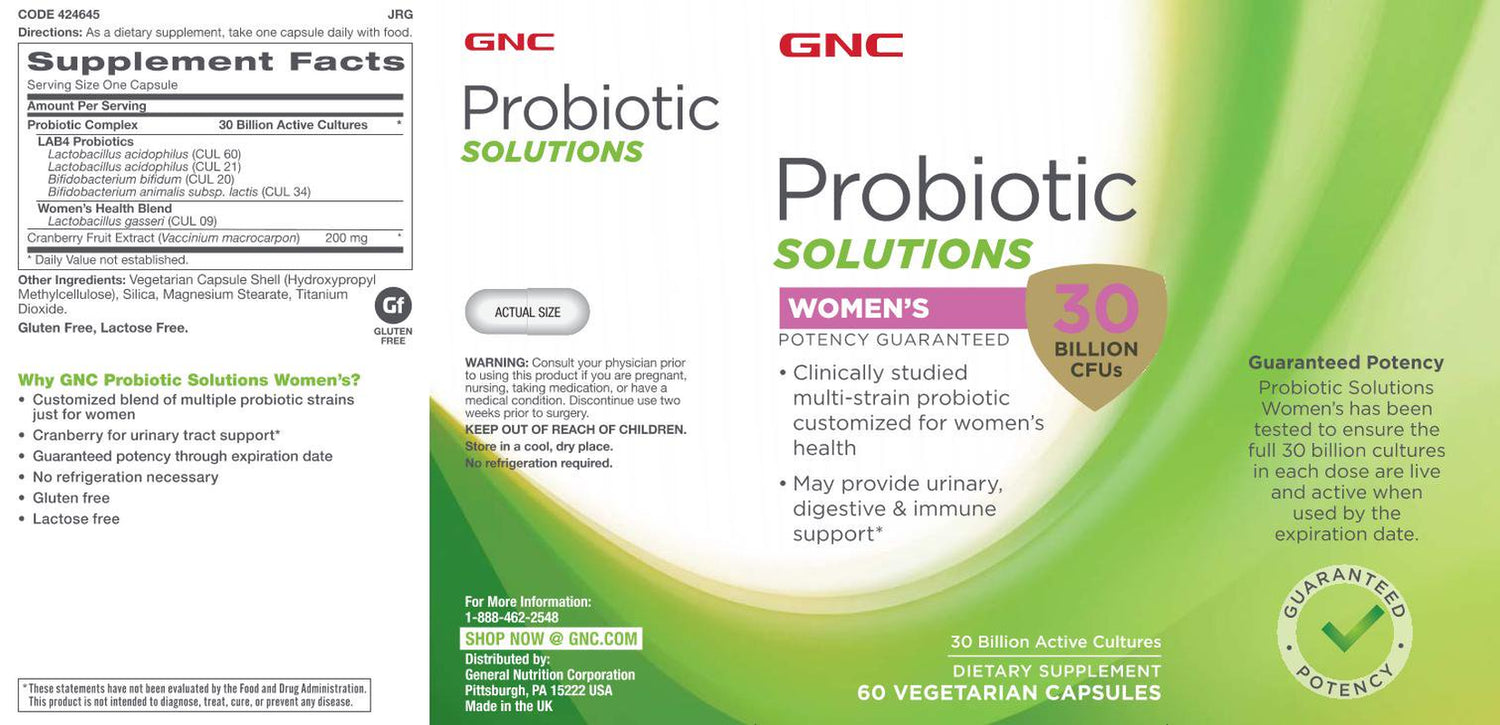 - Why Gnc Probiotic Solutions Women's? Customized Blend Of Multiple Probiotic Strains Just For Women Cranberry For Urinary Tract Support Guaranteed Potency Through Expiration Date No Refrigeration Necessary Gluten Free Lactose Free