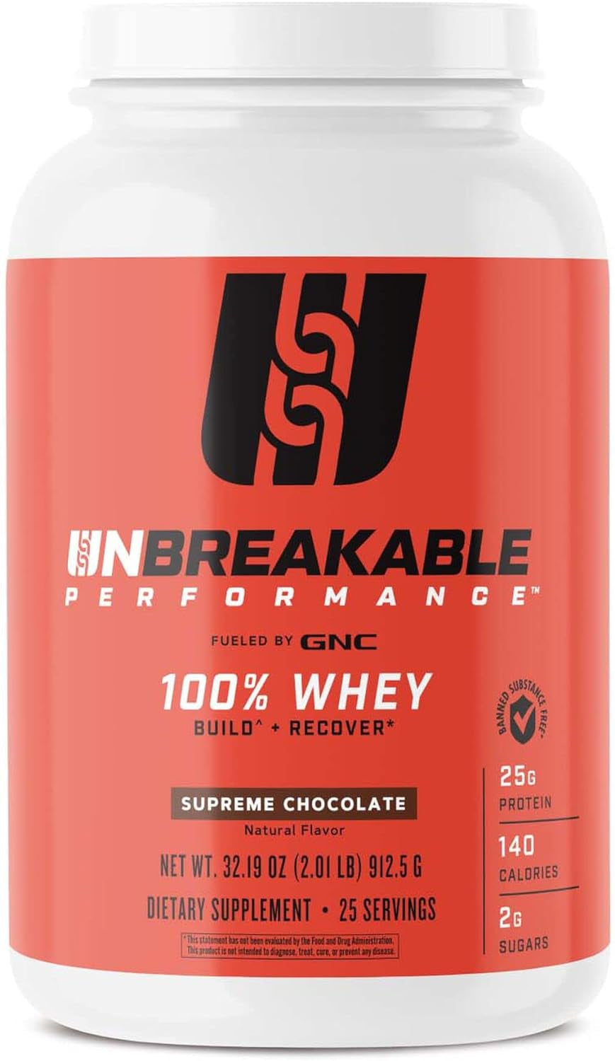 - UNBREAKABLE PERFORMANCE Fueled By GNC 100% Whey – Supreme Chocolate: Banned Substance Free⬩ Protein Powder Exclusively from GNC and trainer Jay Glazer: Fuel your goals with a protein powder that helps cover the spectrum of your protein needs with all 9 essential amnio acids. Every purchase of UNBREAKABLE PERFORMANCE contributes to the incredible Merging Vets & Players program, a non-profit organization helping combat veterans and former professional athletes transition into their new lives.