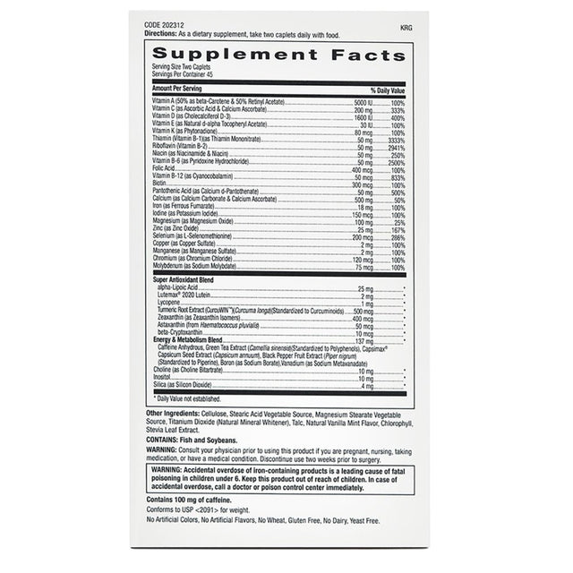 GNC Women's Multivitamin - Energy & Metabolism: Clinically Studied Multivitamin Energy, calorie burning, and antioxidants. More antioxidant power than ever and over 30 clinically studied ingredients in every formula - all in smaller, easier-to-swallow pills. Contains 100 mg of caffeine per serving. Women's Health: Contains a clinically studied women's multivitamin formula shown to work better than a basic multivitamin.^ Helps to support bone health. Energy: Shown to improve levels of key B vitamins^ essential for energy production. Calorie Burning: Features a combination of thermogenic ingredients ingredients that may support calorie burning and mental sharpness. Antioxidants: Packed with antioxidants to help fight free radicals that can be produced by intense exercise. ^In a randomized double-blinded, placebo-controlled study of 112 healthy volunteers subjects, taking the GNC vitamin and mineral blend for 6 weeks experienced significant improvements in serum levels of certain key nutrients compared to a placebo and a leading multivitamin formula based upon multivariate statistical analysis of a group of B vitamins (thiamin, niacin, riboflavin, pantothenic acid, biotin, folic acid and vitamins B-6, and B-12) and key antioxidants and carotenoids (a group of beta-carotene, alpha-tocopherol, selenium lutein and lycopene). Statistical improvements in SF- 36 Vitality and Mental Health Score were also overserved compared to placebo.