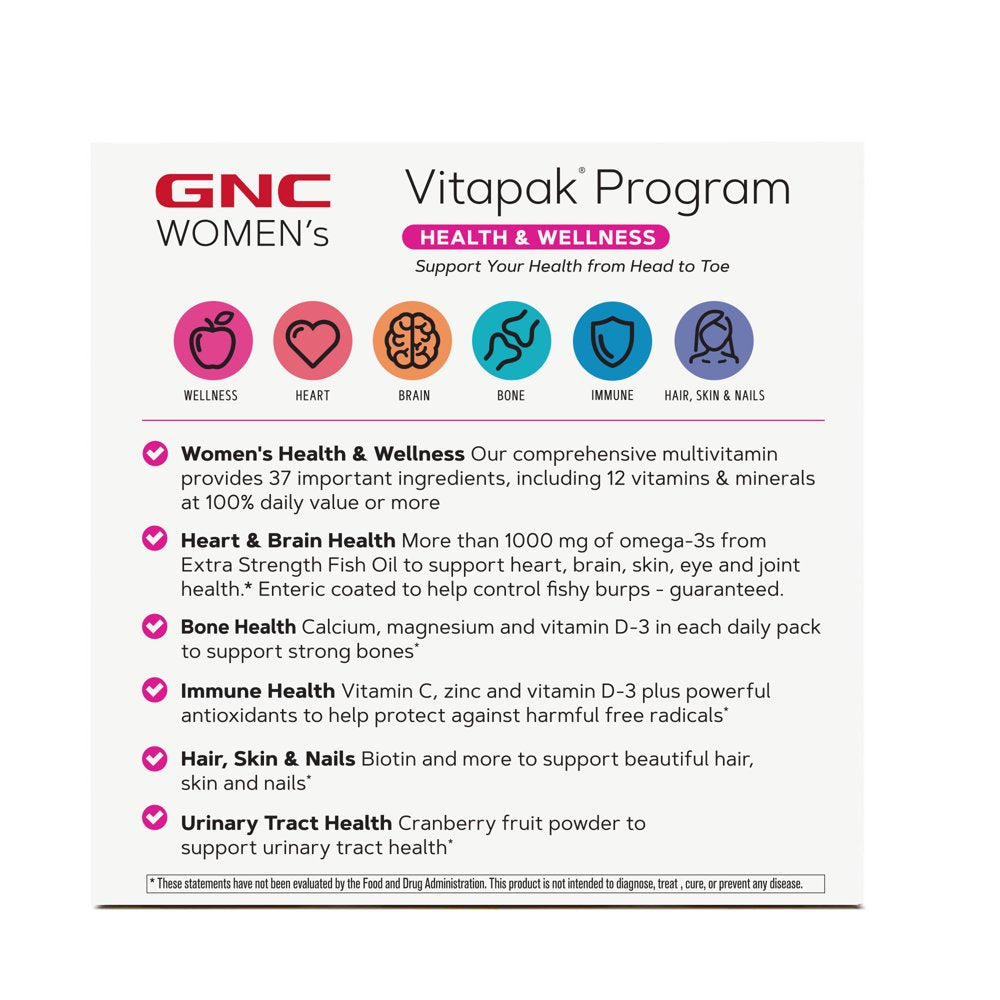 GNC Women's Health & Wellness Vitapak is a customized 4-in-1 nutrition program for comprehensive daily women's health support that combines the benefits of a GNC Women’s multivitamin and Extra Strength Omega-3 Fish Oils plus formulas to support immune, bone, heart, brain, & urinary tract health, as well as beautiful hair, skin, & nails —all in convenient daily packs that take the guesswork out of your nutrition regimen*. Each daily vitamin pack is specially curated to supports the unique Health & Wellness needs of women and delivers over 40 important nutrients, vitamins, mineral, herbs, fruits, veggies, and Omega-3 Fish Oils for unmatched nutritional support and incredible value*.