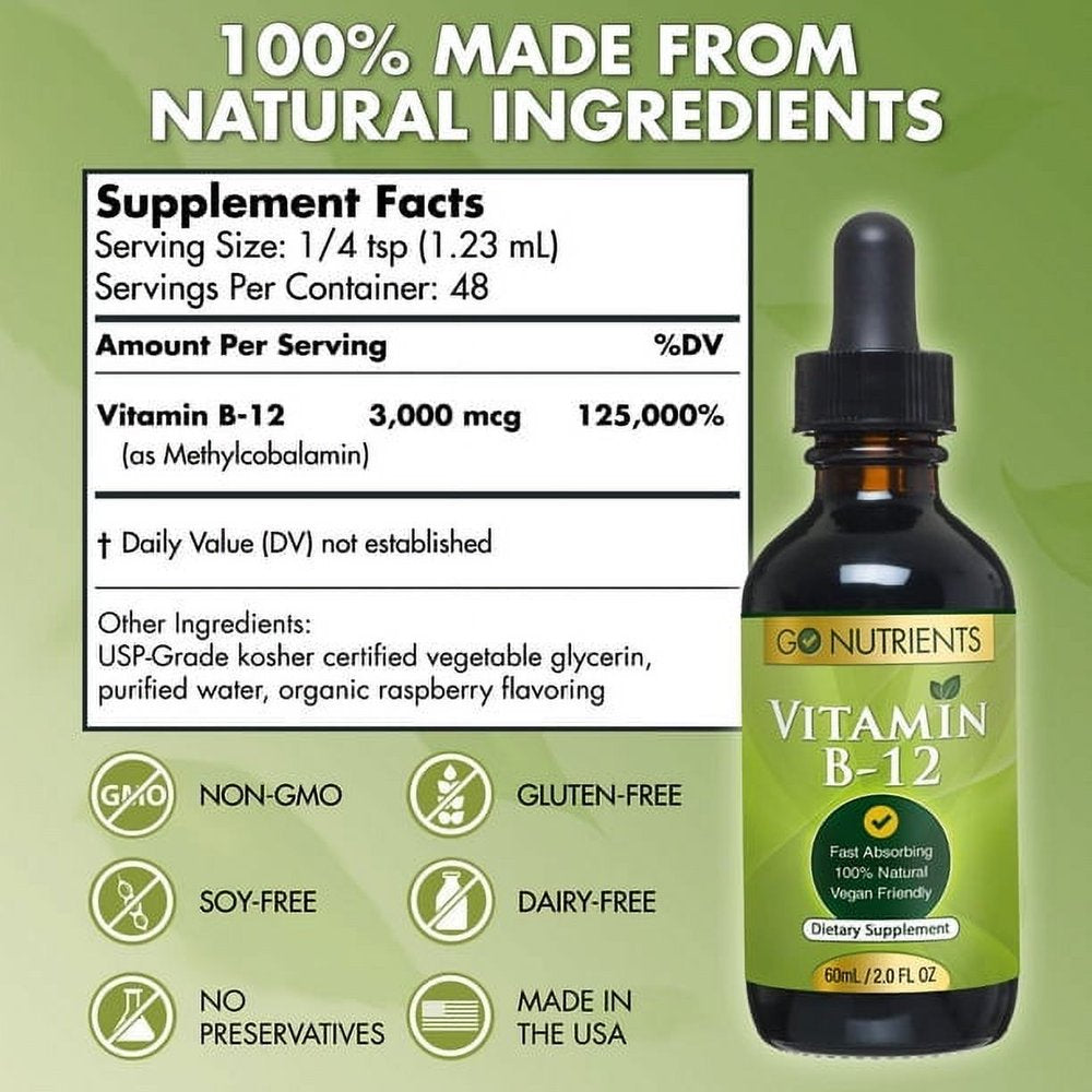 - ALL NATURAL: Go Nutrients uses only the finest ingredients available for a potent liquid supplement. Our vitamin B12 liquid drops contain no preservatives or artificial sweeteners. This Methylcobalamin B12 is also vegan-friendly.