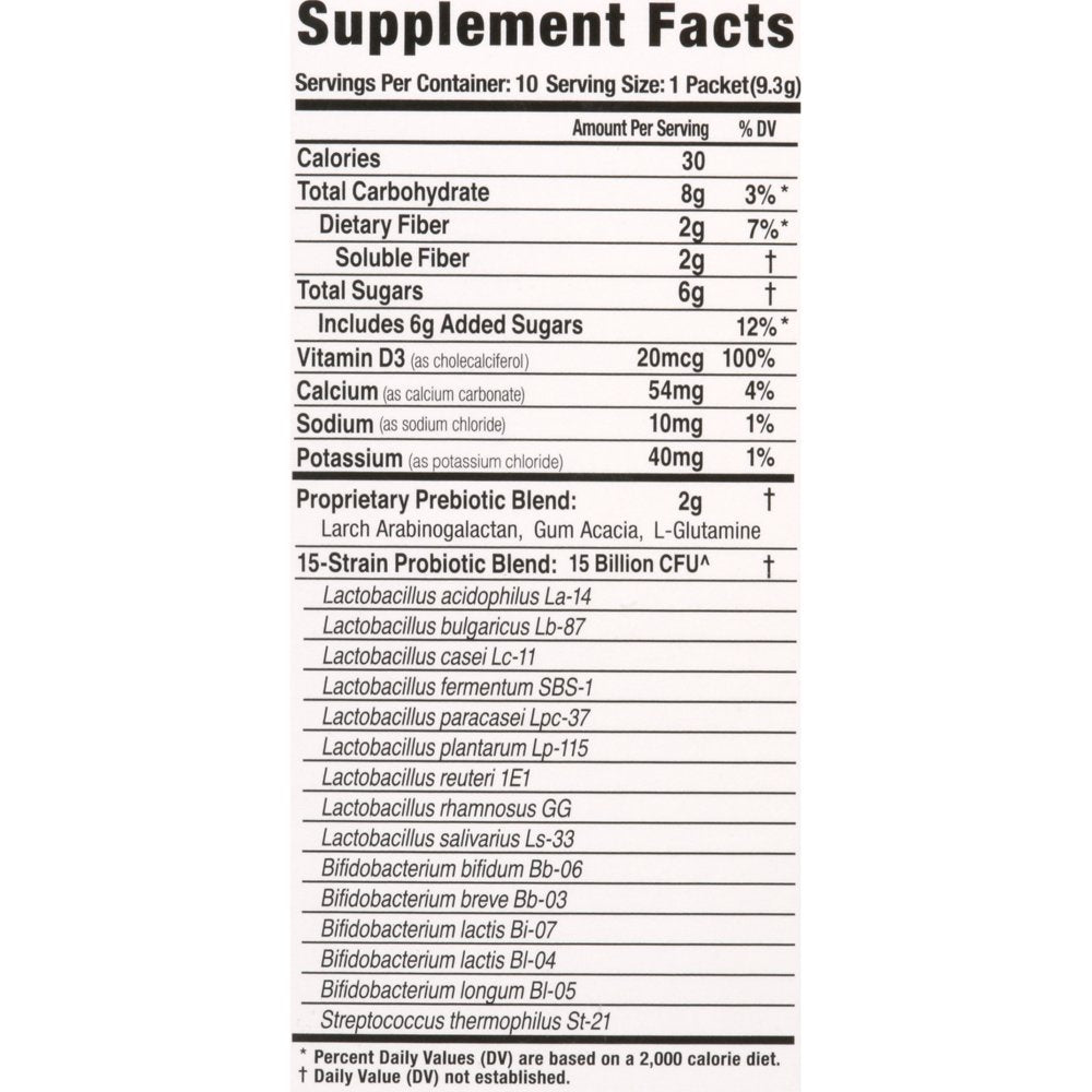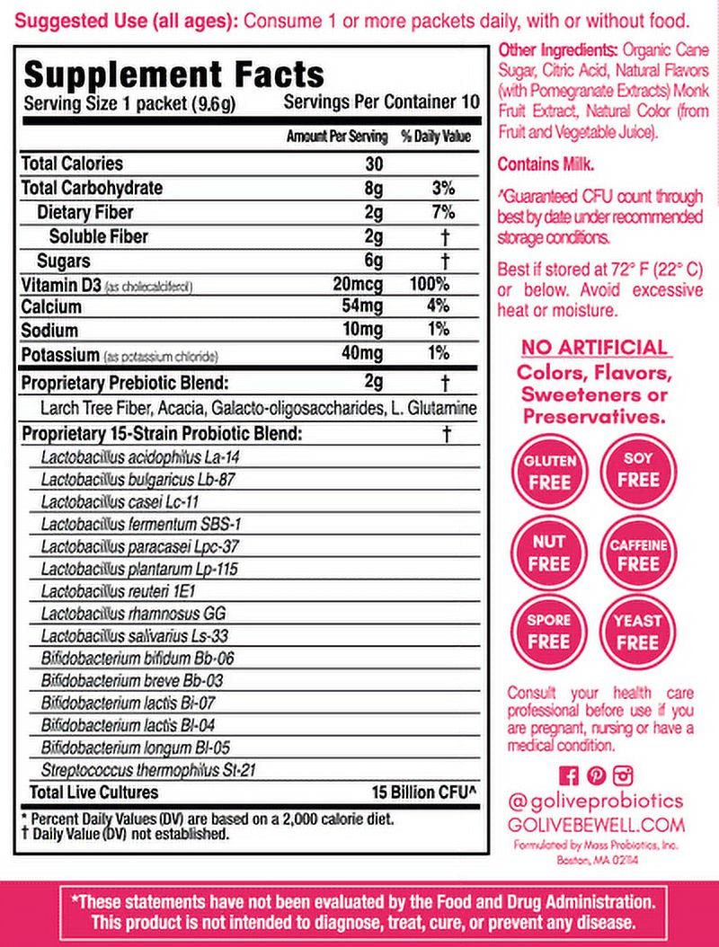 - Probiotic + Prebiotic Supplement. 15 billion live cultures probiotic strains. Great for all ages. Kids too! 30 Day Supply: maintain 1 packet every 2-3 days. 10 Day Supply: restore 1+ packets daily. Digest. Metabolize. Defend. +vitamin D3. +l. glutamine. Add to H2O or to any food/drink less than 75 degrees F. Go with your gut. Experience the GoLive difference. Better probiotics, better prebiotics, better delivery - better effects. 15 Probiotic Strains (Probiotics = Beneficial Bacteria): B. bifidum Bb-06; B. breve Bb-03; B. lactis BI-04; B. lactis SD-5220; B. longum BI-05; L. acidophilus La-14; L. bulgaricus Lb-64; L. casei Lc-11; L. fermentum SD-5847; L. paracasei Lpc-37; L. plantarum Lp-115; L. reuteri SD-5865; L. rhamnosus Lr-32; L. salivarius Ls-33; S. thermophilus St-21 + prebiotics (prebiotics = food for beneficial bacteria). L. glutamine. Galactooligosaccharide. Gum acacia. Larch gum. Cane sugar. Digestion. Metabolism. Immunity. Better Probiotics - GoLive products contain a complex blend of fifteen documented and clinically-tested probiotic strains. Better Prebiotics - Once blended in liquid, GoLive probiotics begin to grow and colonize as they consume the nourishing blend or prebiotic soluble fibers and sugars. Better Delivery - GoLive probiotic products are freeze-dried and individually packaged in foil to prevent exposure to moisture and harmful heat-generating light. As a result, the probiotics are alive and growing when it counts - at time of consumption. Better Effects - Probiotics play a key role in health and wellness by colonizing in the gastro-intestinal tract - the location of 100% of the digestive function, the basic of metabolic function and 70%-80% of the immune function. We take care of our probiotics - so they can take care of you! GoLive - be well. No gluten. No yeast. No soy. Non-GMO. No artificial flavors; sweeteners; colors. No preservatives. No b. coagulans. www.golivebewell.com. (These statements have not been evaluated by the Food and Drug Administration. This product is not intended to diagnose, treat, cure, or prevent any disease.)