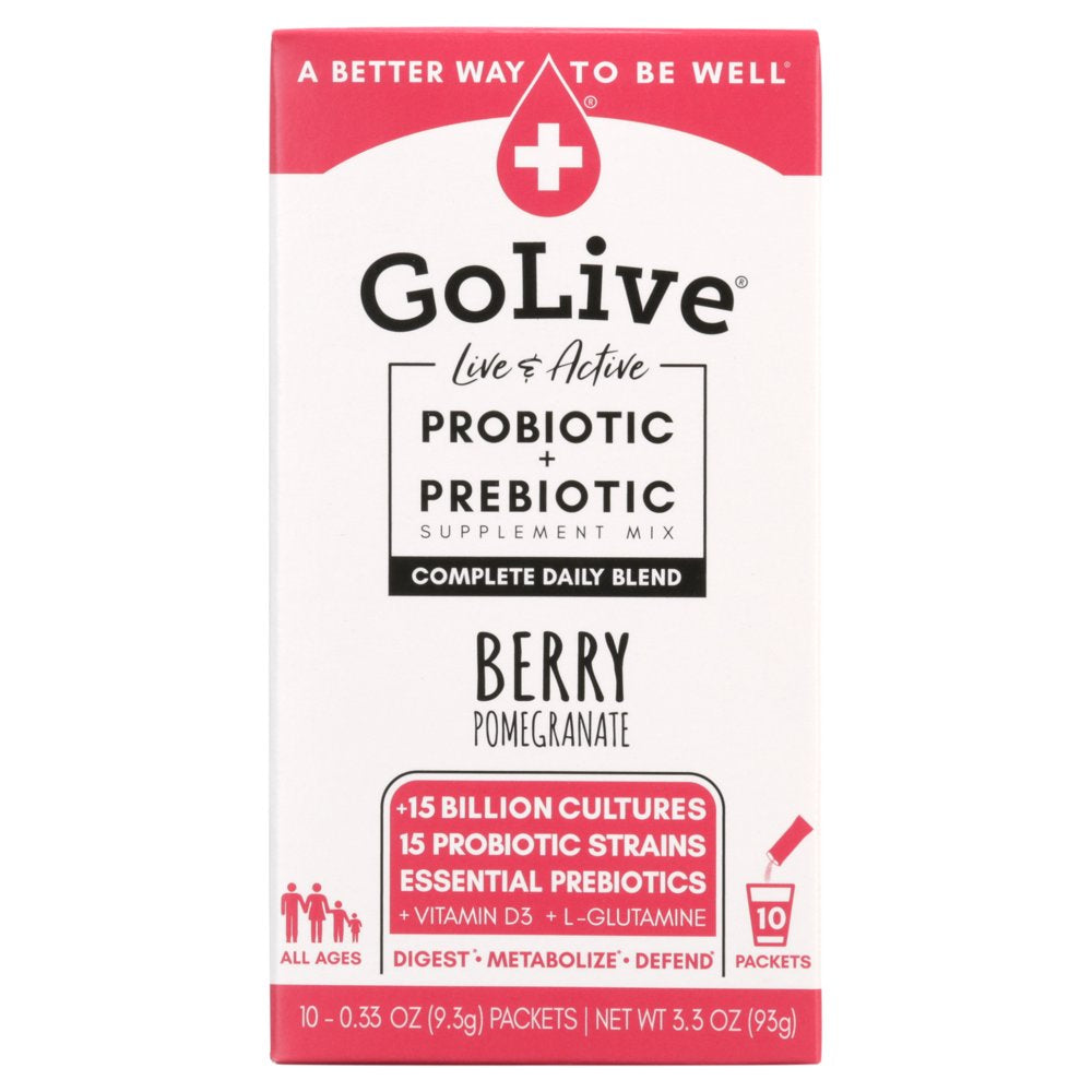 GoLive - Probiotic & Prebiotic Berry Pomegranate 15 Billion CFU - 10 x .34 oz. Packets GoLive Berry Pomegranate Probiotic & Prebiotic is formulated to be an optimal combination of complex probiotic strains and essential prebiotics.