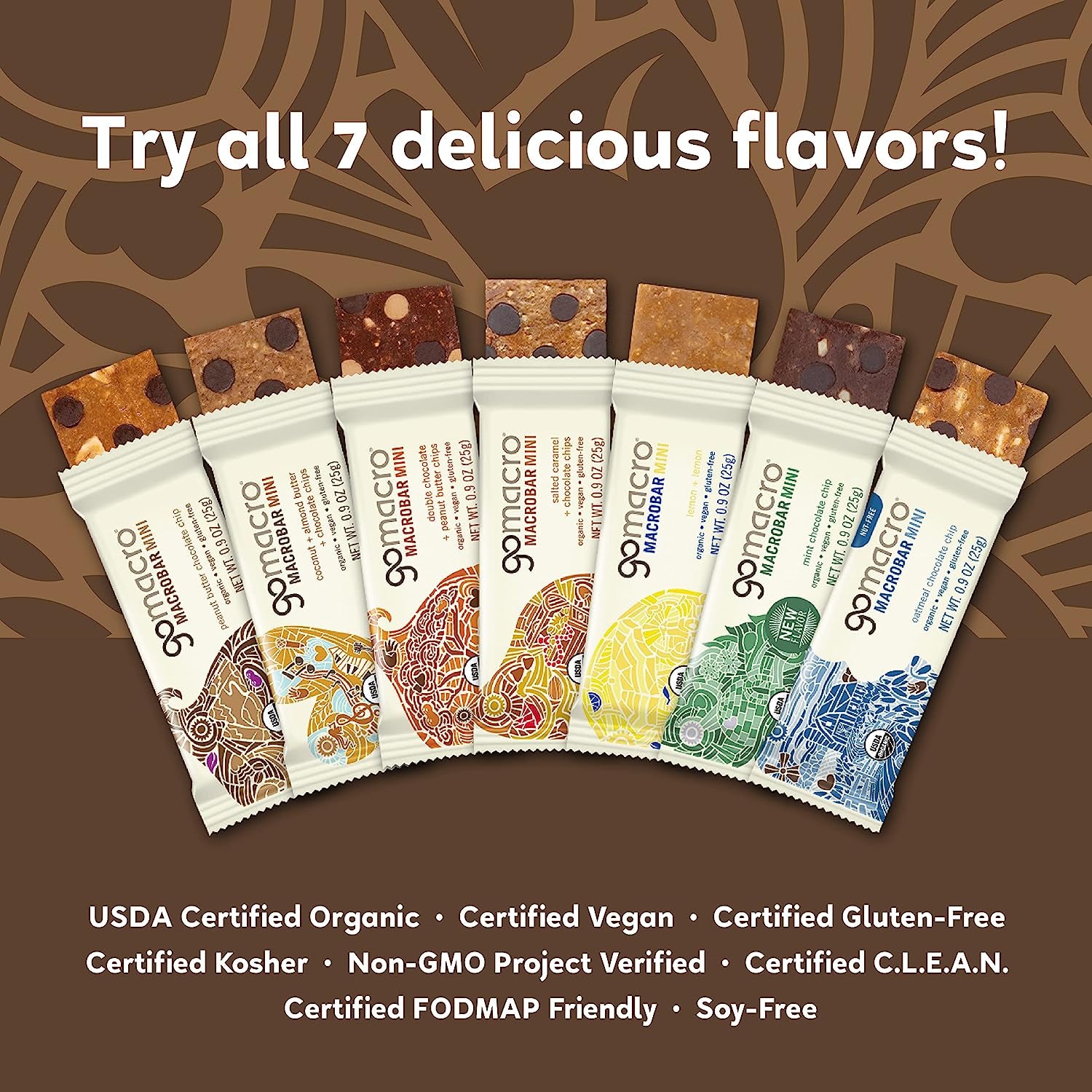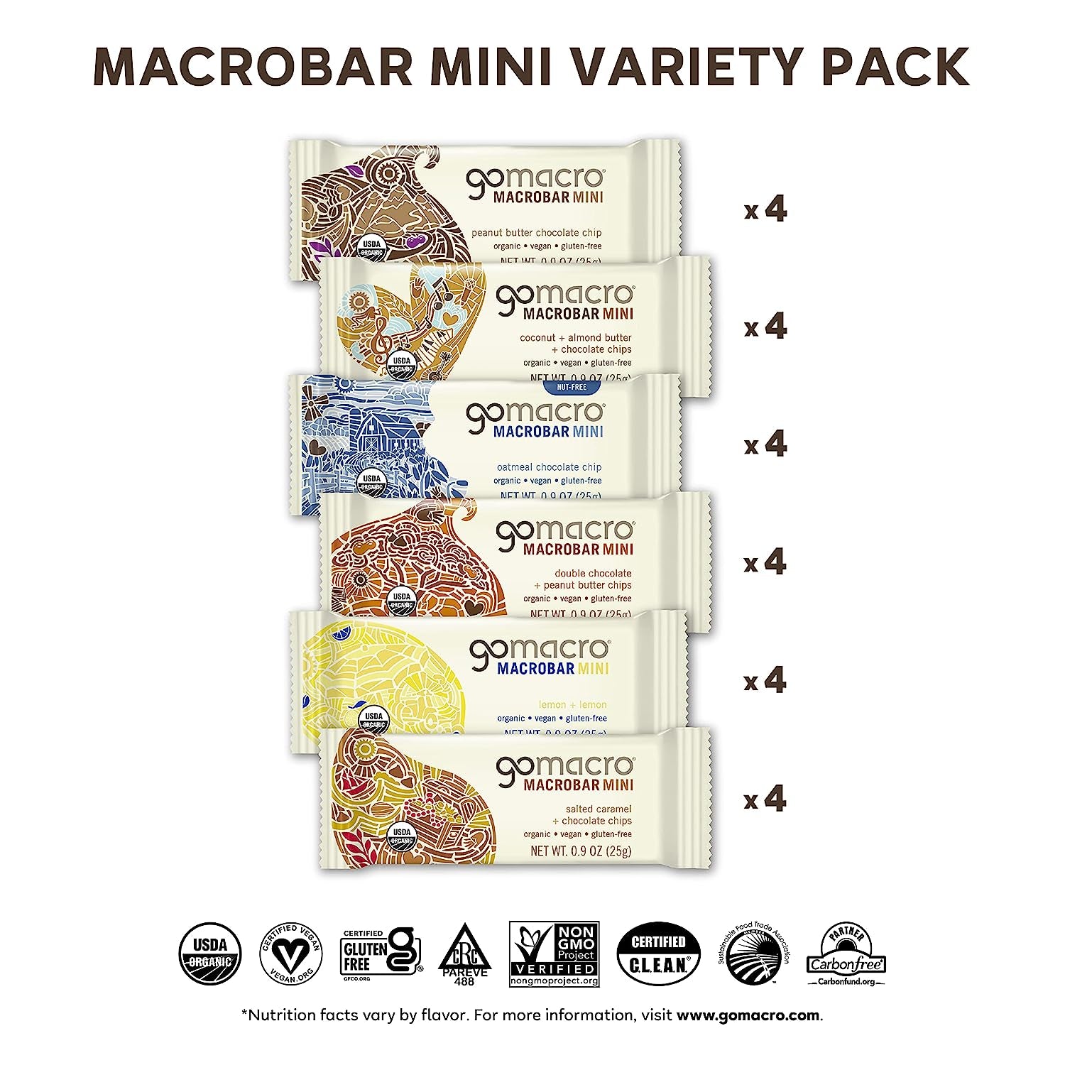 - CERTIFICATIONS YOU CAN TRUST: All GoMacro MacroBar Minis are Certified Organic, Vegan, Gluten-Free, Kosher, Non-GMO, C.L.E.A.N., FODMAP Friendly, and Soy-Free so you can snack with confidence. If there were a certification for delicious, we’d have that too!