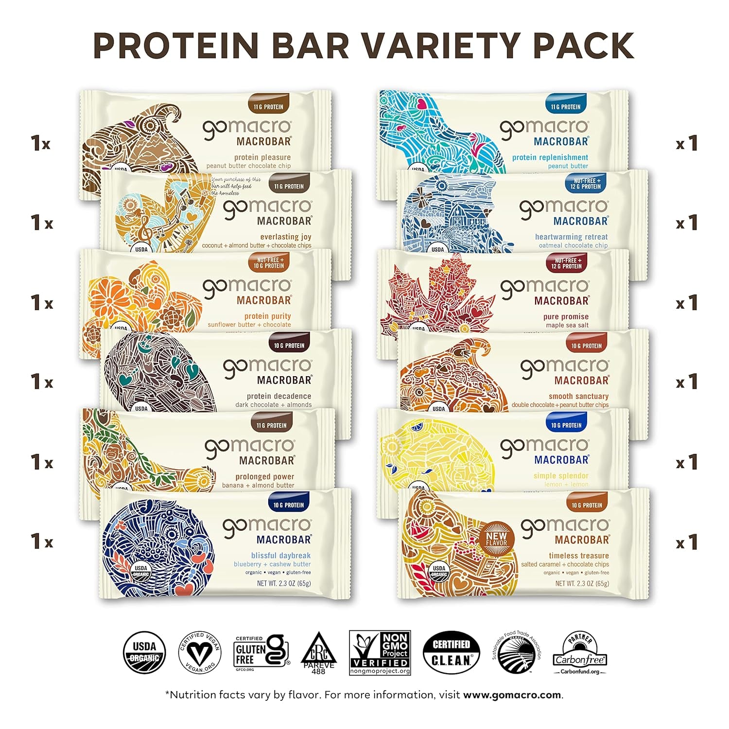 - CERTIFICATIONS YOU CAN TRUST: All GoMacro protein bars are Certified Organic, Vegan, Gluten-Free, Kosher, Non-GMO, C.L.E.A.N., and Soy-Free so you can snack with confidence. If there were a certification for delicious, we’d have that too!