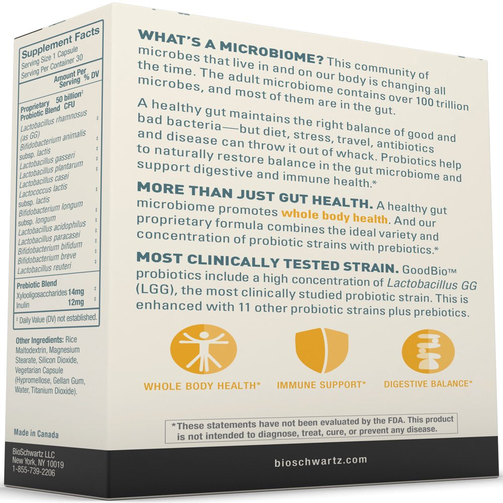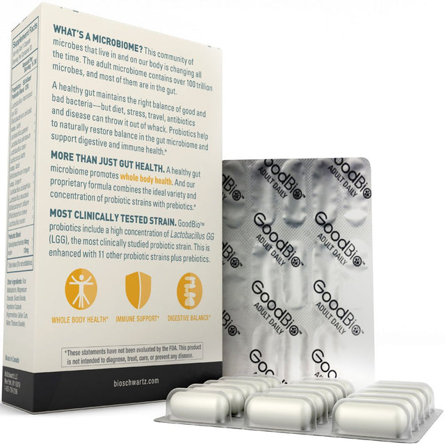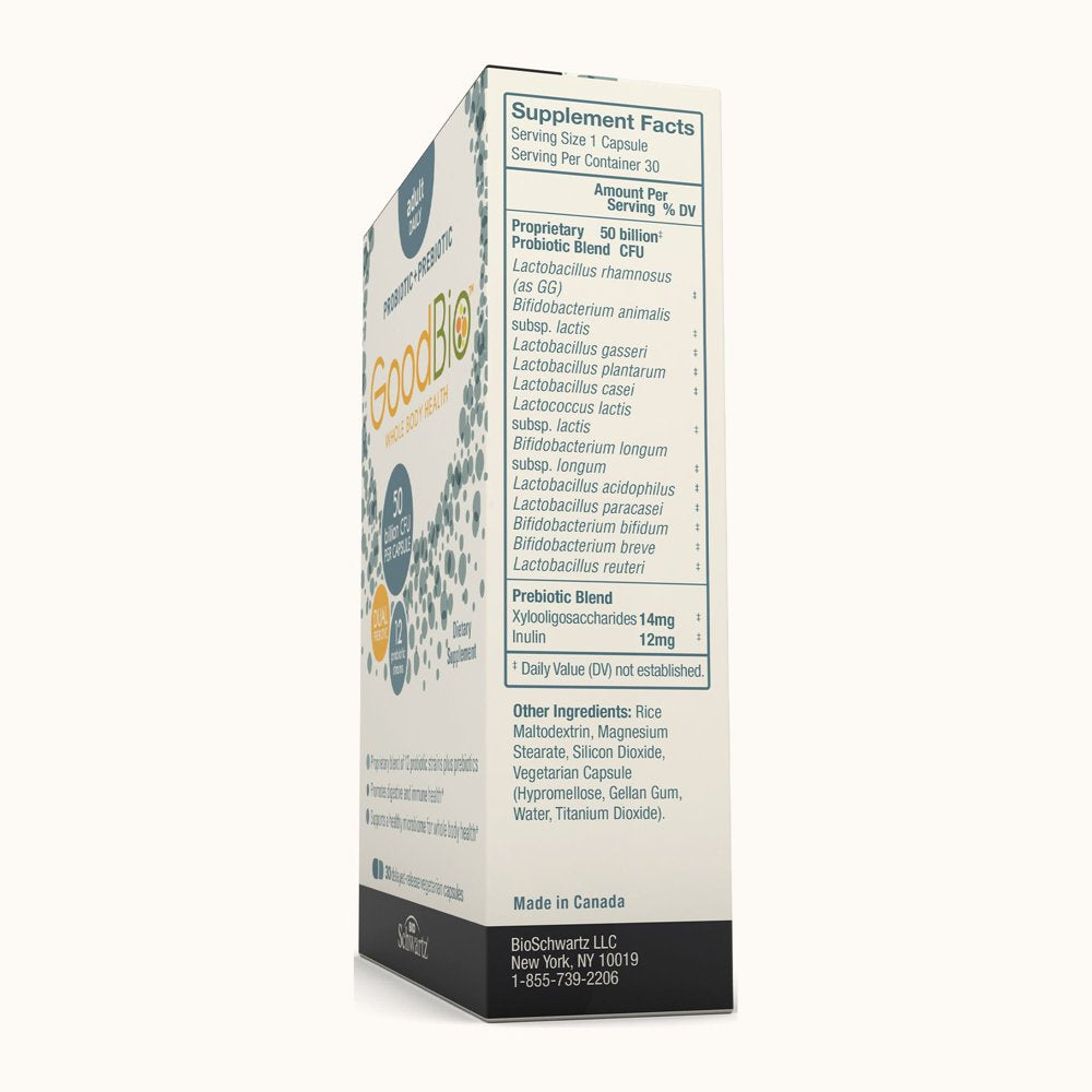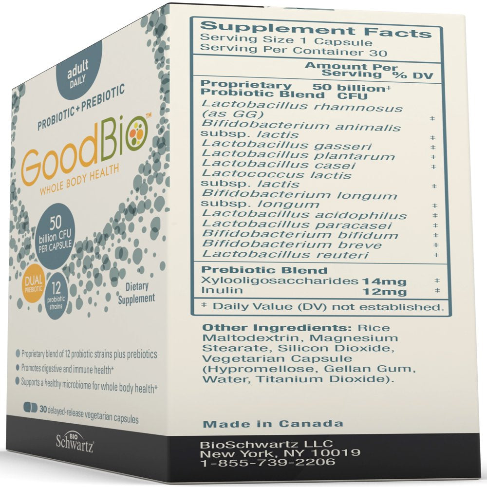 - DESIGNED FOR MAXIMUM EFFECTIVENESS: BioSchwartz GoodBio Probiotic + Prebiotic Adult Daily contains 12 different probiotic strains designed to help promote whole body health. Our capsules are delayed-release, which can allow more of the 50 billion CFUs to survive stomach acid, bile, and oxidation.