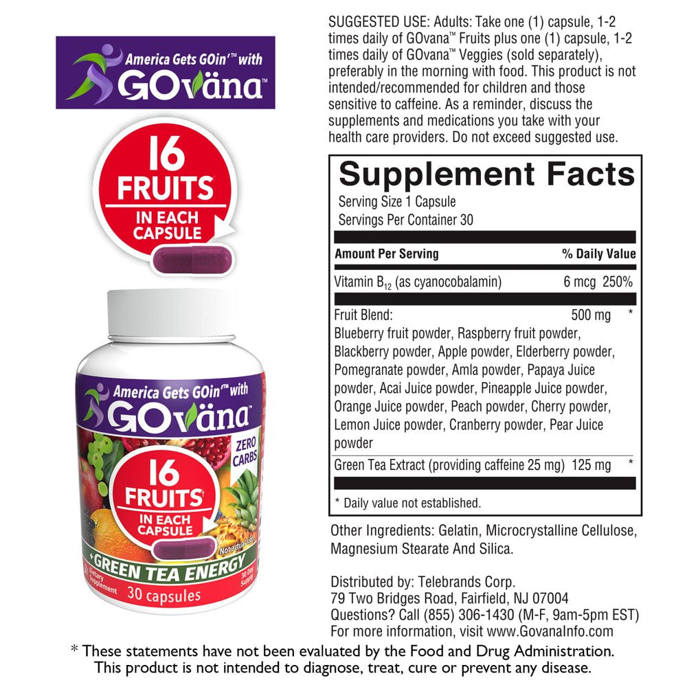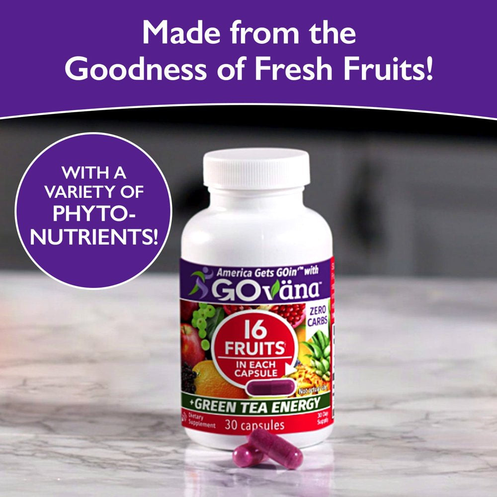 - 16 Different Fruits: when you take GOvana Fruits capsules, you’ll supplement a variety of phytonutrients from the powders of 16 different fruits like blueberry, raspberry, blackberry, apple, açai, cranberry, elderberry, pomegranate, amla, papaya, pineapple, orange, peach, cherry, lemon, and pear!