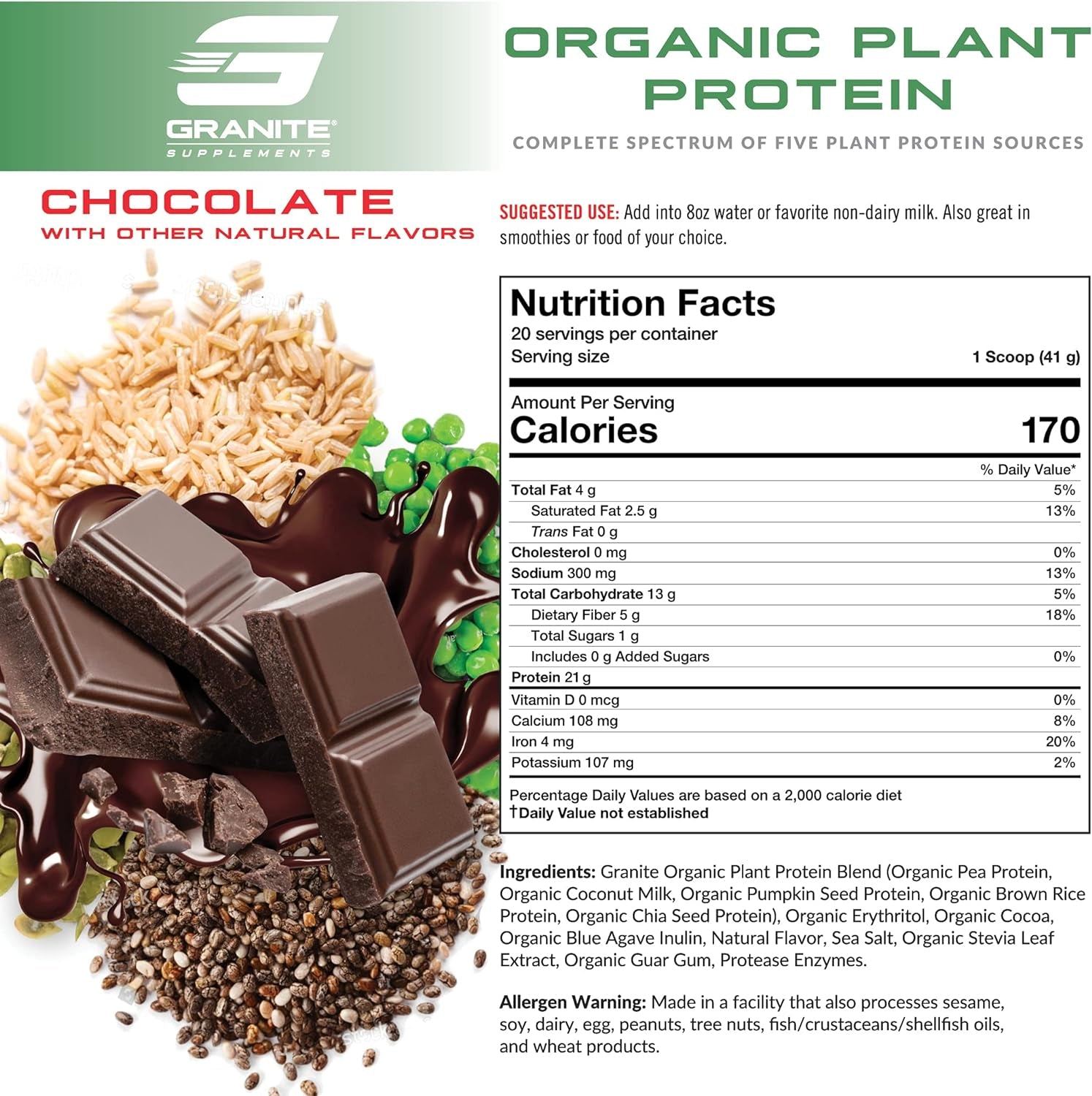 Granite® Organic Vegan Plant Protein (Chocolate) | 21G Complete Spectrum Protein to Build Lean Muscle | 5 Plant Sources: Pea, Pumpkin, Chia, Rice, Coconut Milk | No Gluten, Dairy or Soy | 1.8Lb