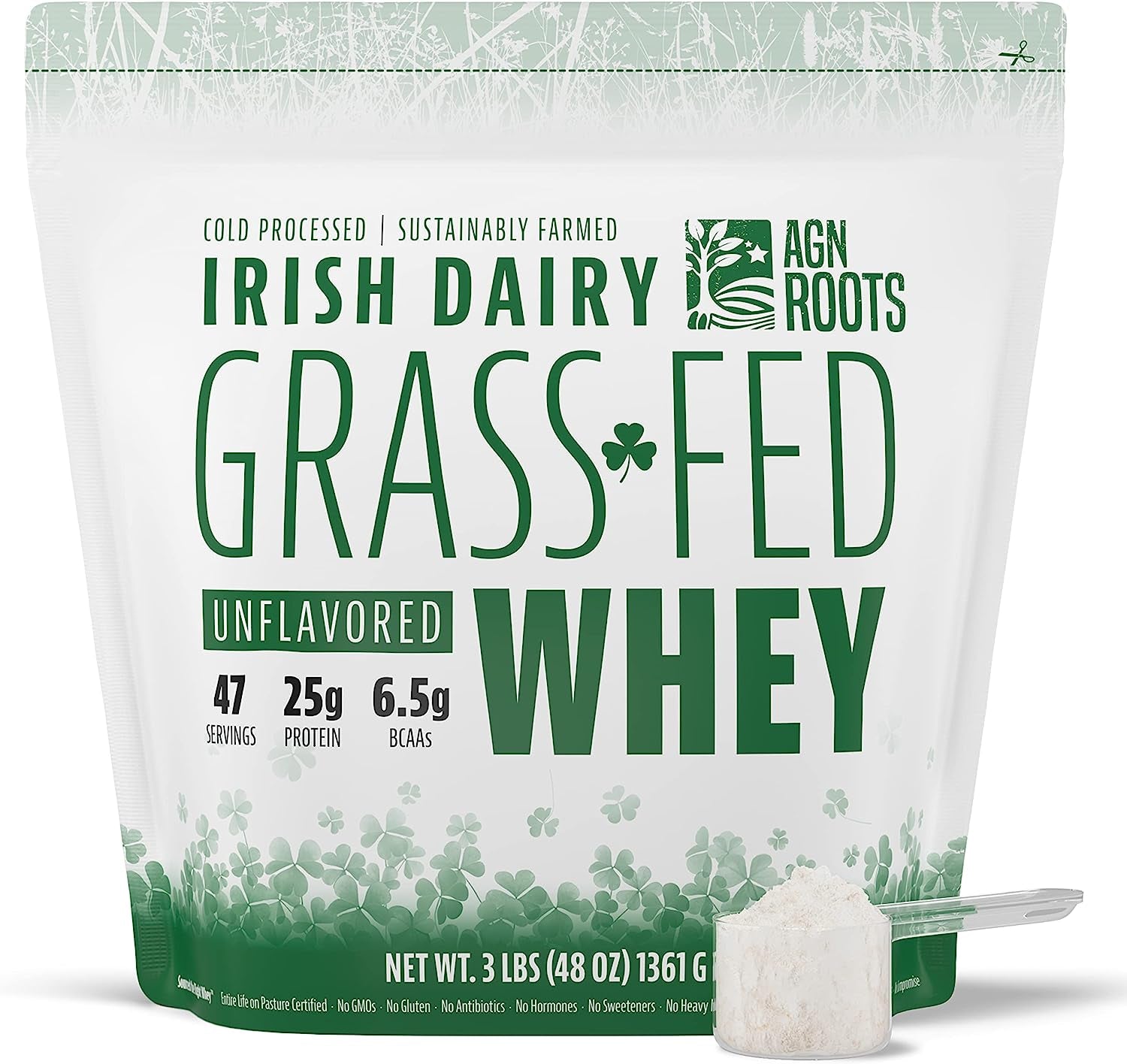 AGN Roots Grassfed Whey is cold processed to ensure the naturally occurring muscle building peptides are intact and bio-available. As the result of superior truly grassfed sourcing, AGN Roots Grassfed Whey contains the highest BCAA concentration per 25 grams of protein available, leading even the marketed premium grassfed brands by more than 10% in naturally occurring BCAAs concentrations weighing in at 6.5G of BCAAs for 25G Protein. The days of purchasing a 5lb PET tub need to be over; you can now enjoy a 3 lb offering commensurate with 5lb bulk deals delivering 47 servings of always-fresh product in our environmentally responsible, thermally protected, UV barrier pouch. Enjoy it!