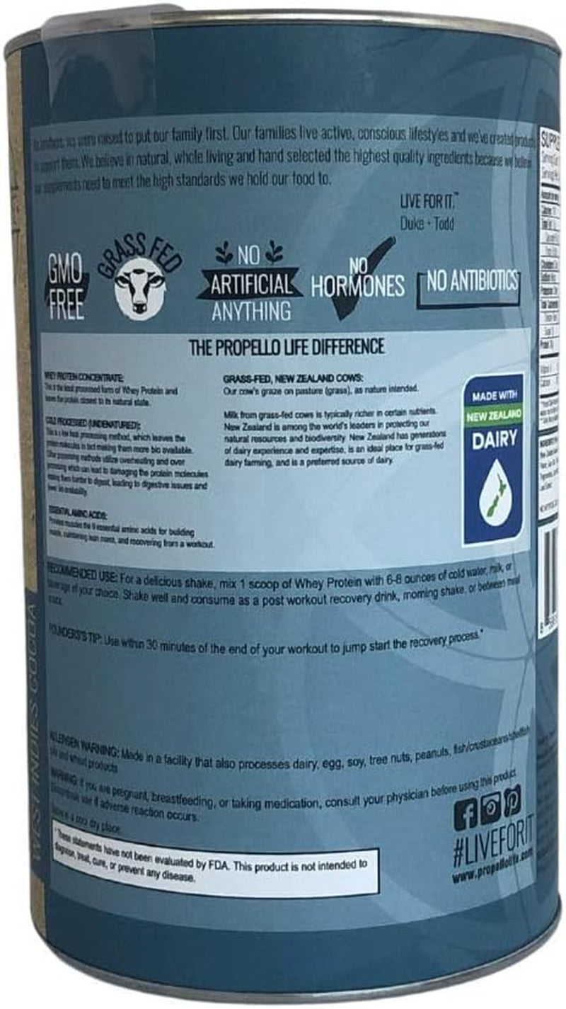 Propello Life's Whey Protein is made with the best grass-fed whey protein from New Zealand. It is non-gmo, hormone free, antibiotic free, and free of artificial ingredients. It is also cold processed - meaning the manufacturing process uses the least amount of heat as possible to preserve the protein at its most natural state - making it easier to digest and more bioavailable. The west indies cocoa flavor will have you thinking you are drinking a chocolate milkshake!