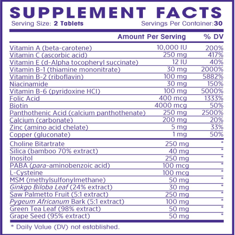 - Contains Biotin, Saw Palmetto, Folate, Silica + 20 More!