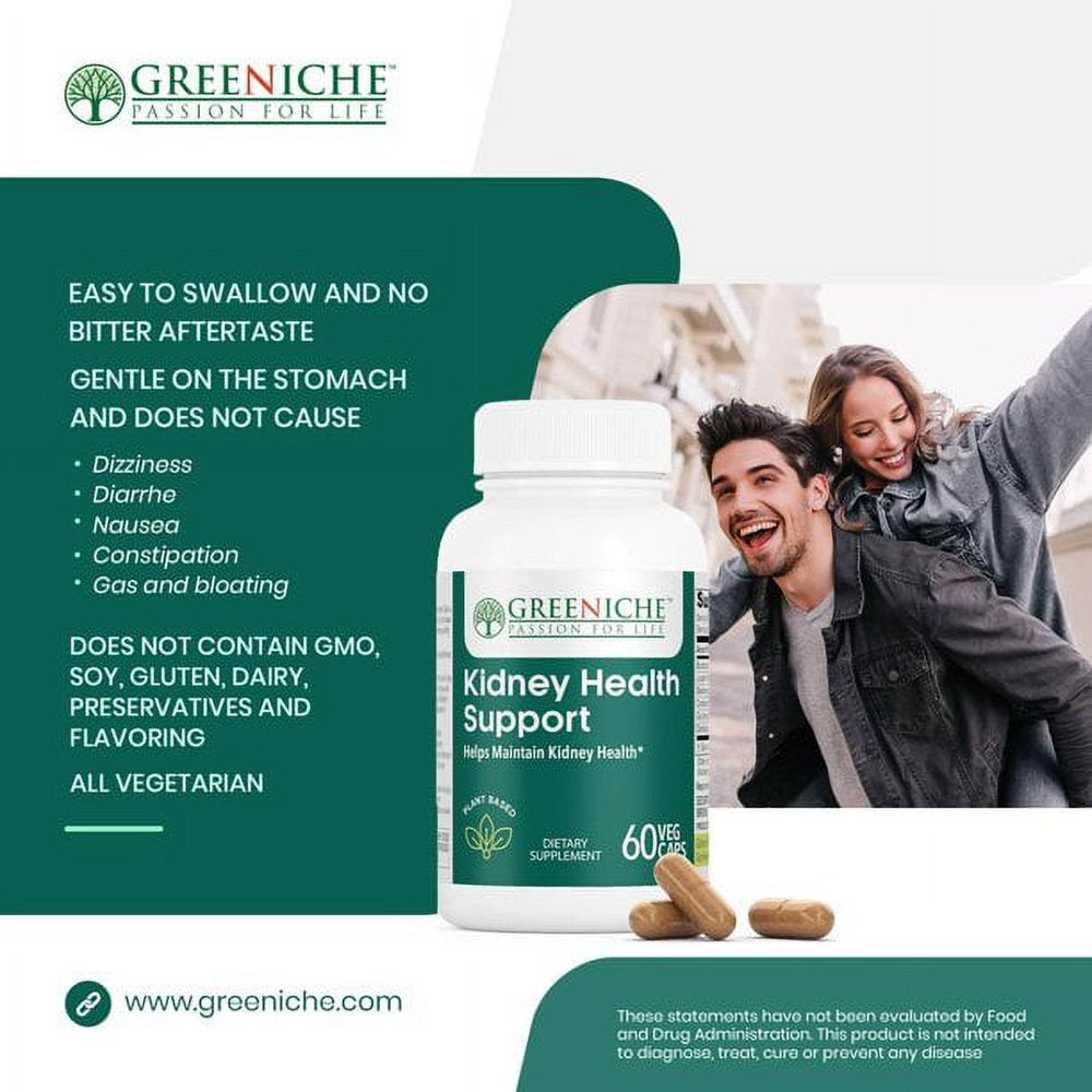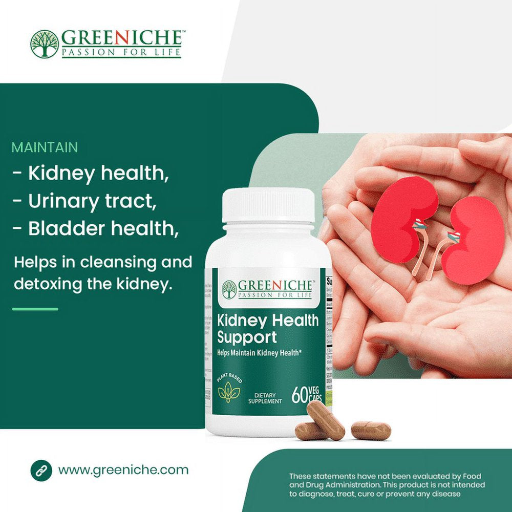 - HELPS TO CLEANSE AND PROTECT KIDNEYS: Greeniche Kidney Health Support is formulated to support proper and effective Kidney function. It helps to stimulate the fast cleanse and detoxification of Kidney’s from the harmful substance that causes discomfort in Kidneys. Our Kidney Health Support Supplement is vegetarian and the capsules are small and easy to swallow and does not contain any taste
