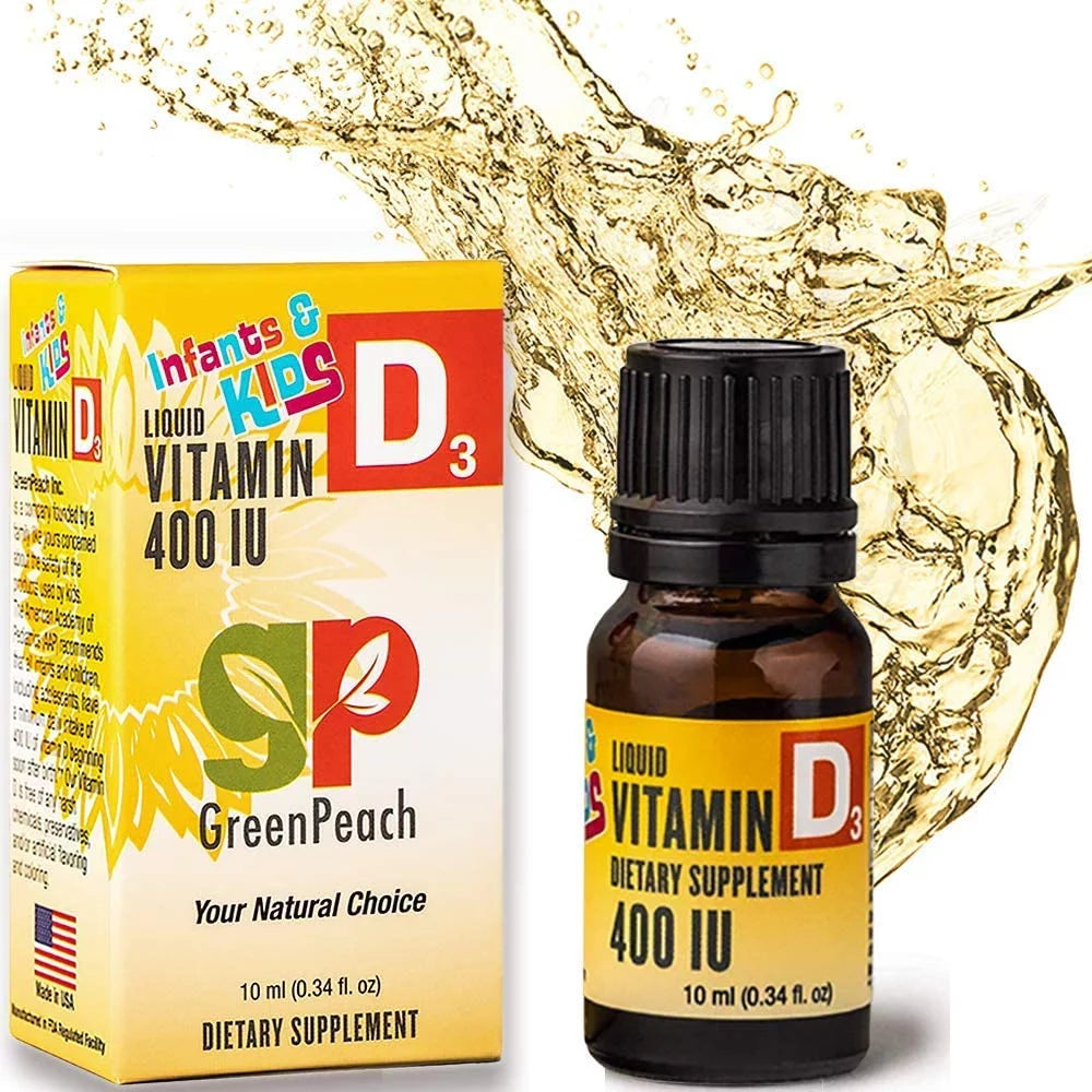 GreenPeach Vitamin D3 Drops for Kids & Adults, Immune Support & Bone Health Supplements with 100% Organic Olive Oil, 400IU GreenPeach Vitamin D3 organic Drops 400IU is formulated for kids and adults alike to meet the needs D3 requirements in an easy-to-consume liquid form. This all-natural product features top-grade 100% organic olive oil as the only other ingredient. It is a Non-GMO product, free of colours and flavours, and is gluten and yeast-free. It can easily be added to formula, milk, juice or other foods with a mess-free dropper system that allows for simple measurement of dosage. WHY VITAMIN D3 IS ESSENTIAL TO BONE GROWTH Vitamin D3, or cholecalciferol, is the natural form of vitamin D that your body absorbs from sunlight. Every child needs this organic Vitamin D to absorb calcium more efficiently and build strong bones. A deficiency in vitamin D can cause bone and muscle pain or even lead to soft bones. A LIQUID SUPPLEMENT EASIER FOR BABY If you breastfeed your baby, you know how tricky it can be to mix a supplement in your infant’s food. Just a few drops of liquid Vitamin D3 may be put directly on the breast or in your baby’s milk. With the Euro Dropper system, you can measure and give your baby the exact number of drops that he/she needs. HOW VITAMIN D3 CAN SUPPORT ADULTS For adults, a vitamin D supplement assists in the promotion of healthy bones and teeth through the regulation of Calcium. It will also support immune, brain and nervous system health while helping to regulate insulin levels; a useful benefit to those with diabetes. GreenPeach formulas can be scaled for the different age groups. At GreenPeach, we are committed to providing you with the best product possible. If these Vitamin D3 drops for infants and adults do not satisfy you for any reason, send them back to us and you will receive a 100% refund.