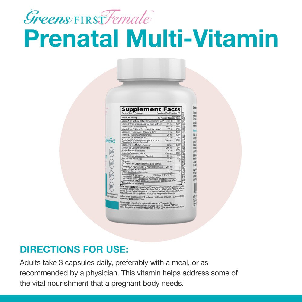 - PROPER NUTRIENTS FOR MOTHER & BABY. Greens First® Female Prenatal Vitamin with Vegan DHA delivers critical nutrients, like DHA, folic acid, and folate, to baby and mother.