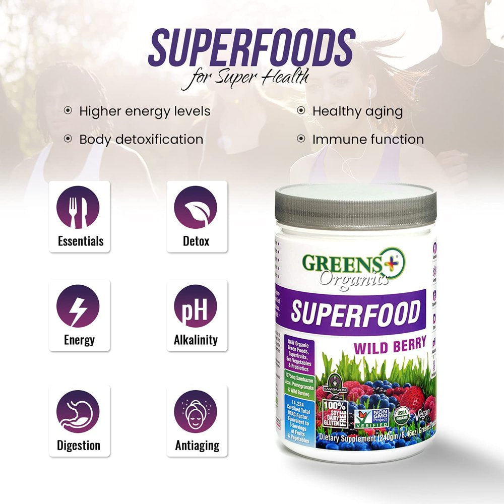 - As per customer demand, Greens Plus Organic Super Food Wild Berry is a great way to supplement your diet with beneficial nutrients in a convenient and easy to use powder form.