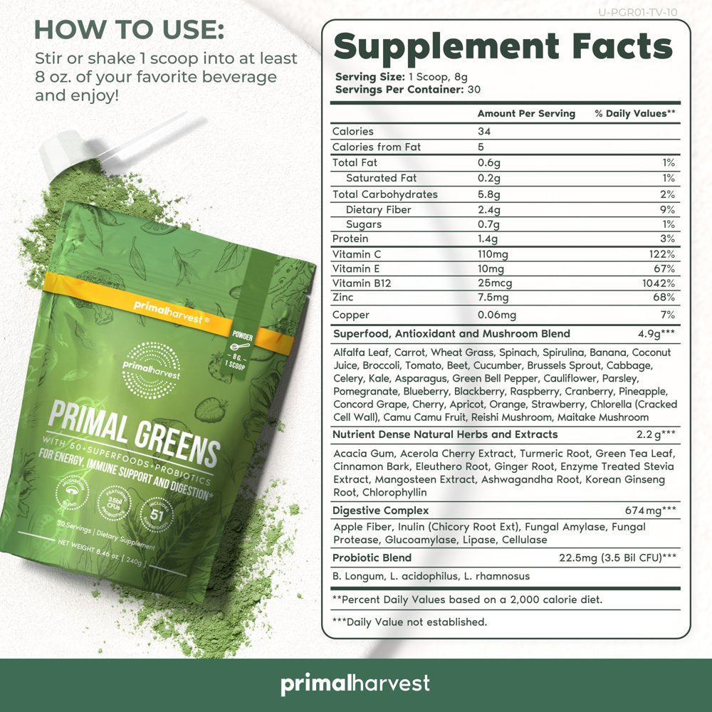 Daily Superfood Greens Powder is made with 51 Different powerful Ingredients that make it simple & easy to boost your greens in your diet. Perfect in smoothies & recipes. All Natural Ingredients, Made in the USA. Loaded with Potent Ingredients to help you increase energy, detoxify and protect your body the USA is made with the highest quality natural fruits & vegetables made in our GMP-certified facility naturally low in sugar & sodium helps regulate metabolism & curb unhealthy cravings8g of superfood & mushroom blend per serving Contains all recommended daily vitamins and minerals boost immune response & resistance to viruses. Gluten-free, Allergen-free, Dairy-free, and non-GMO Super Greens Powder by Primal Harvest, 30 Servings w/+50 Greens Superfood Chlorella, Probiotics, Green Tea, Wheatgrass, Kale, Turmeric, Green Superfood Powder for Energy - Primal Greens Green Powder