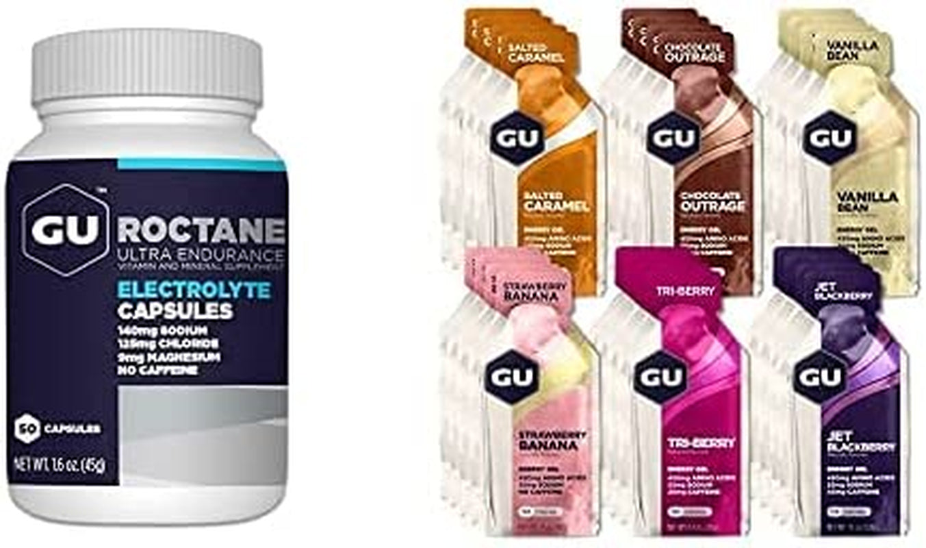 GU Energy Variety Pack, Roctance Ultra Endurance Electrolye Capsules (50-Count Bottle) and Assorted Flavors Energy Gels (24-Count)