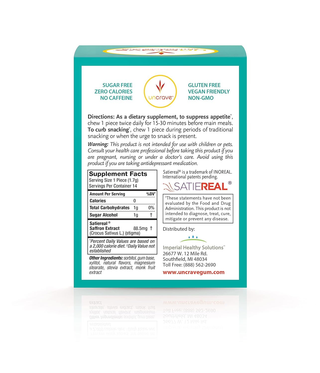 - Convenient and Travel-Friendly - Experience the many benefits of Satiereal saffron extract anytime you need them. UnCrave gum is packed in portable, resealable pouches, keeping it fresh and ready to go whenever you are.