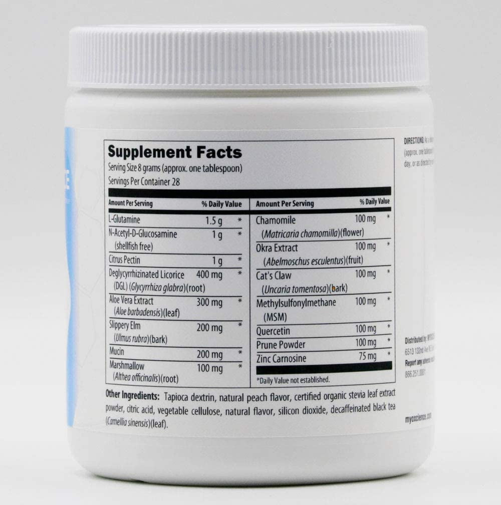 A synergistic blend of over 15 supportive ingredients that supports: The normal repair of the GI mucosal lining* Proper intestinal function* Healthy nutrient absorption* Regularity and healthy bowel function* The nutrients chosen in Gut Barrier Enhance are were chose because they: Contain a Powerful Herbal Blend - DGL, slippery elm, marshmallow, chamomile, okra extract and cat’s claw provide comprehensive support of gut function by coating and soothing the intestinal lining. It may also help relax the intestines, which aids in alleviating occasional cramping.* Aloe Vera - promotes a variety of ‘good’ bacteria in the gut.* MSM - a sulfur-containing compound that supports the structure, integrity, and permeability of cell walls.* Mucin - classified as a glycoprotein, a protein with a carbohydrate group attached to it; mucin is normally secreted by the intestinal cells and can foster overall integrity of the gut.* Does Not Contain: Wheat, gluten, corn, yeast, soy protein, dairy products, peanuts, tree nuts, egg, ingredients derived from genetically modified organisms (GMOs), artificial colors, artificial sweeteners, or artificial preservatives. Not labeled for sale in California. Other Ingredients: Tapioca dextrin, natural peach flavor, certified organic stevia leaf extract powder, citric acid, vegetable cellulose, natural flavor, silicon dioxide, decaffeinated black tea (Camellia sinensis)(leaf).
