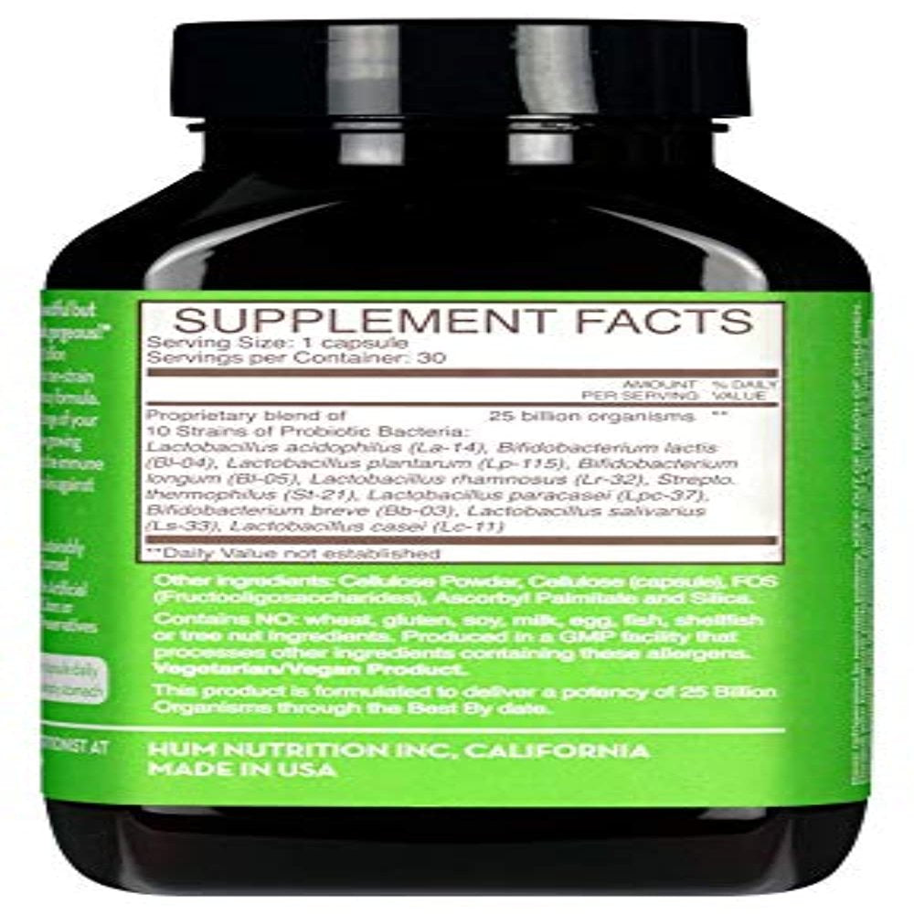 PROBIOTICS FOR GUT HEALTH - This daily vegan blend supports a balanced gut microbiome and healthy digestion with more probiotic strains than some other gut health supplements and probiotics.,10 STRAINS - Gut Instinct is formulated with 10 potent strains for digestive health including Lactobacillus and Bifidobacterium to support gut diversity. Some of the probiotics in Gut Instinct may promote microbiome balance.,HOW IT WORKS - Probiotics are good bacteria that keep the digestive tract healthy and promote balance excellent for a gut microbiome supplement. Lactobacillus bacteria is an excellent digestion probiotic. The Bifidobacterium strain may promote healthy gut diversity.,HOW TO TAKE - Take 1 Gut Instinct probiotic supplement, at any time, on an empty stomach. Gut Instinct can be taken with HUM Flatter Me bloating relief capsules when taken as directed.,VEGAN GUT HEALTH SUPPORT - Gut Instinct is a vegan probiotic supplement. It is gluten-free and contains a non-GMO probiotic formula.