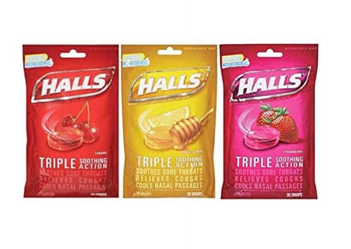 VARIETY PACK of Halls Triple Soothing Action Drops in 3 Delicious Flavors: Cherry, Strawberry & Honey Lemon (3 Packs, 30 Count Each, 90 Drops Total),RELIEVES COUGHS -- Cough Supressant Provides Fast Temporary Relief from Coughs Due to Colds, Allergies or Inhaled Irritants,SOOTHES SORE THROATS -- Oral Anesthetic Quickly Alleviates Discomfort of Occasional Minor Irritation or Sore Throat,FAST RELIEF ADVANCED FORMULA from a Trusted Brand -- Menthol & Eucalyptus Start Working Within Just 10 Seconds to to Relieve Coughs, Soothe Sore Throats & Make Nasal Passages Feel Cooler,ECONOMICAL 3-PACK OFFERS VALUE, VARIETY & CONVENIENCE for Cold & Allergy Sufferers
