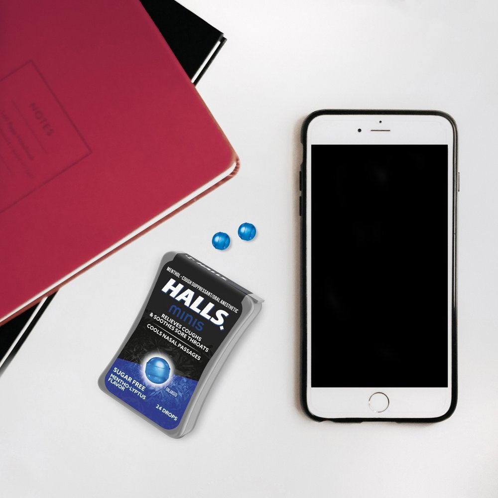 - 1 pack of HALLS Minis Mentho-Lyptus Flavor Sugar Free Cough Drops (24 menthol cough suppressant/oral anesthetic drops total)