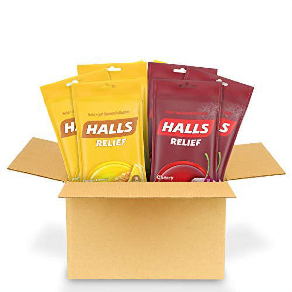 HALLS Relief Variety Pack Honey Lemon and Cherry Cough Drops are ready for whatever life throws, or coughs, your way. Using the power of menthol, HALLS cough drops relieve coughs, soothe sore throats and cool nasal passages to relieve your worst symptoms. This variety pack contains both honey lemon and cherry flavored cough suppressant drops, so you can enjoy any flavor when symptoms hit. Whether you're using these menthol cough drops for sore throat relief, cough relief or as an oral anesthetic, simply dissolve one drop in your mouth slowly, and repeat every two hours as needed. HALLS Relief cough drops are formulated for adults and children five years and older. Each variety pack holds three bags of 30 honey lemon cough drops each and three bags of 30 cherry cough drops each.