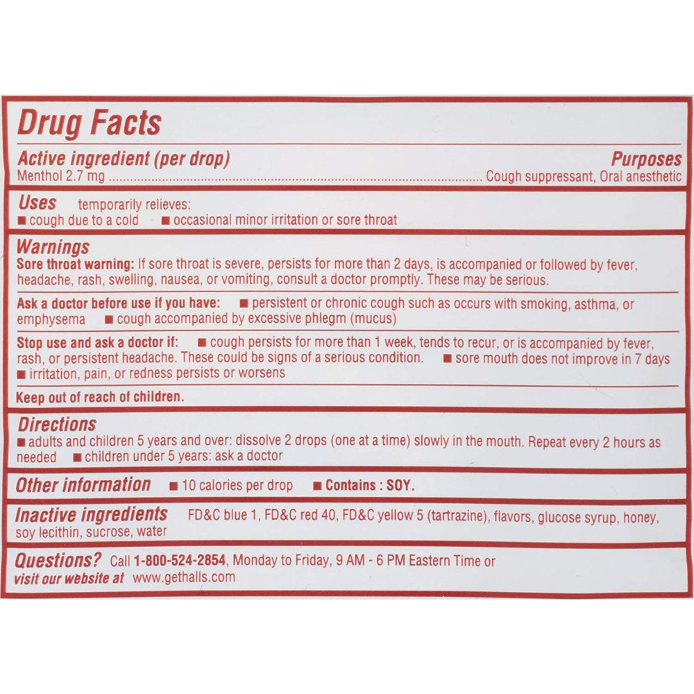 - Temporarily relieves: Cough due to a cold Occasional minor irritation or sore throat. Active Ingredients : 1 Drop: Menthol 2.7 mg Inactive Ingredients : FD&C Blue 1; FD&C Red 40; FD&C Yellow 5 (Tartrazine); Flavors; Glucose Syrup; Honey; Soy Lecithin; Sucrose; Water