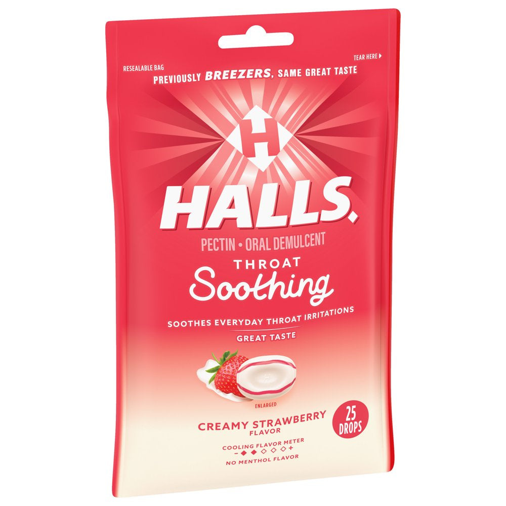 HALLS Throat Soothing (Formerly HALLS Breezers) Creamy Strawberry Throat Drops soothe everyday throat irritations using 7 mg of pectin in each drop. These drops for sore throat have a delicious creamy strawberry flavor with no menthol. For sore mouth and sore throat relief, dissolve one of these sore throat drops by mouth as needed. This package contains 25 individually wrapped throat lozenges and is resealable for freshness and portability.