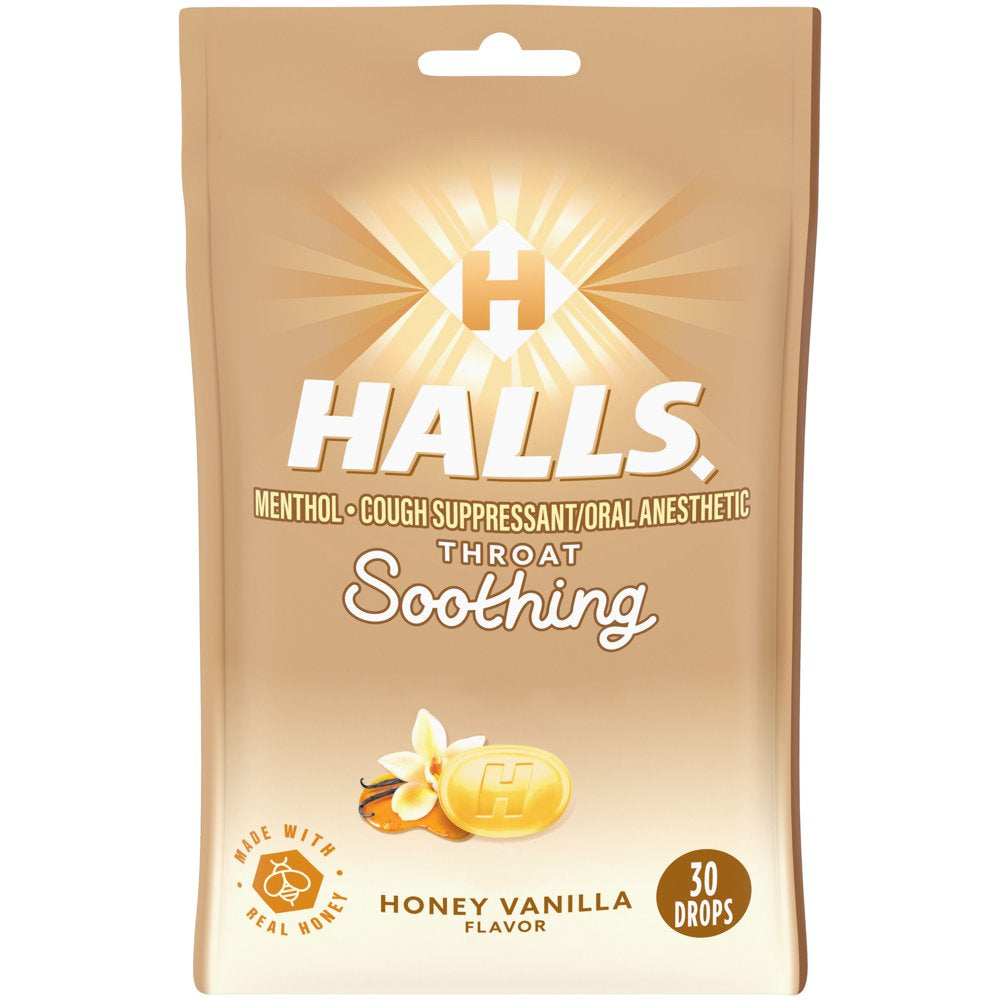HALLS Throat Soothing Honey Vanilla Cough Drops work fast to relieve coughs and soothe sore throats caused by cold and minor irritation. This effective cough suppressant comes in a soothing honey vanilla flavor made with real honey. Dissolve one of these menthol cough drops by mouth every two hours as needed for symptoms. Each bag holds 30 throat lozenges and is resealable for easy stowing in your travel pack or purse.