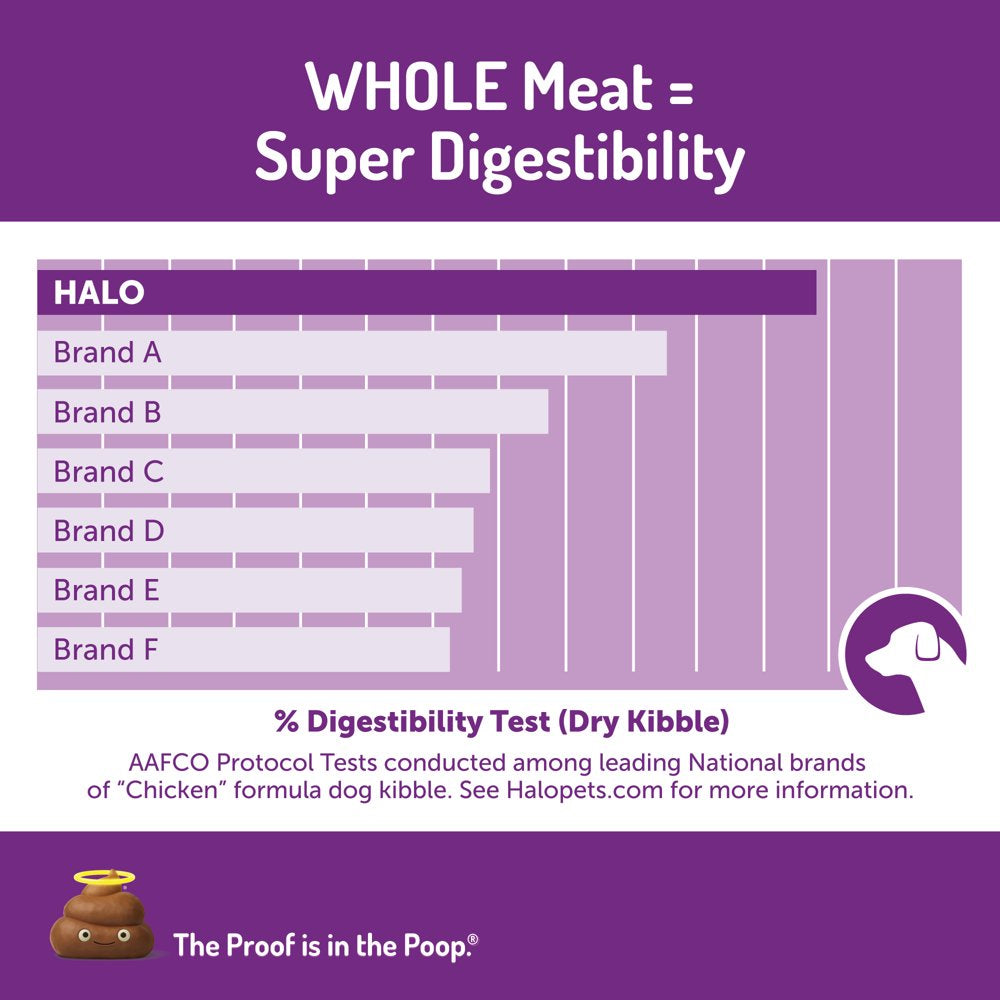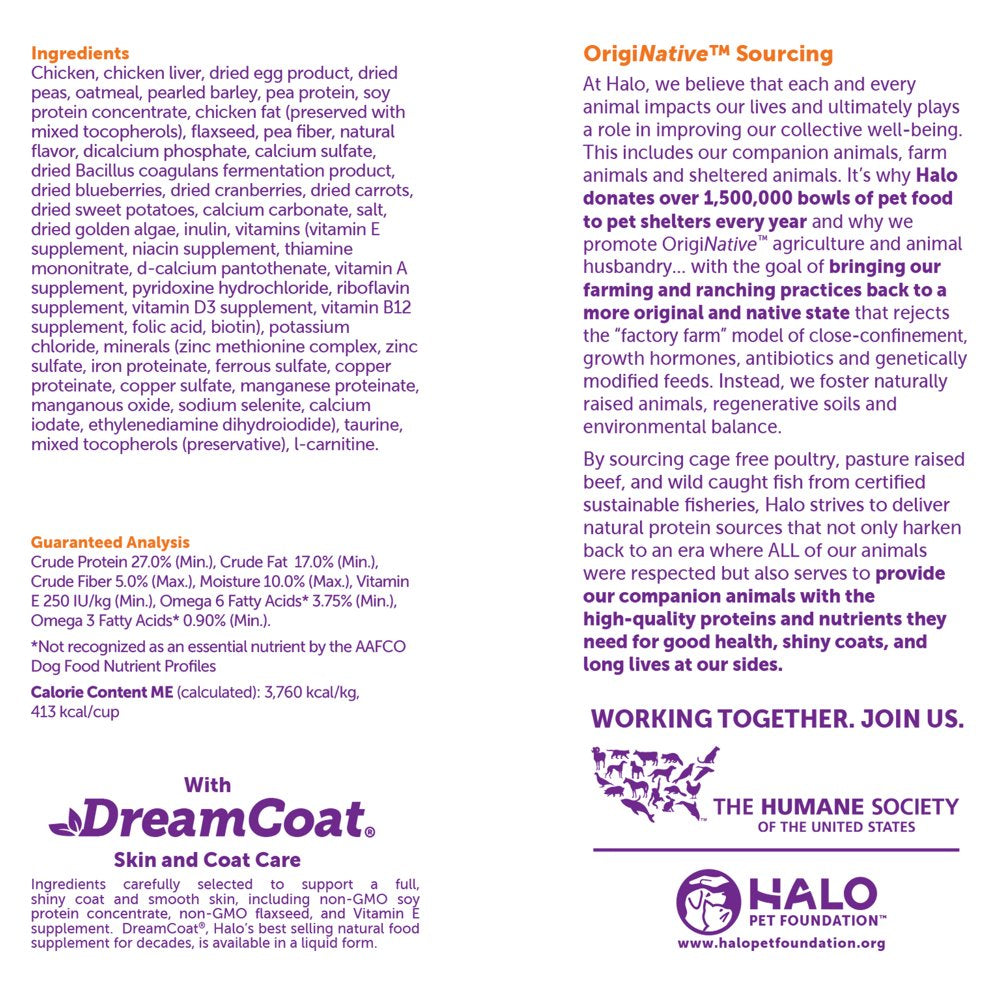 For over thirty years, Halo, Purely for Pets, has created innovative, wholesome, holistic pet care products to give your pet a happier, healthier life. Staying close to nature with whole foods, quality real animal proteins, and the highest standards of sourcing, Halo uses ingredients that you can understand and trust. Their all-natural recipes and formulas are based on extensive study combined with the input of nutritional experts; the results are award-winning. Halo Spot's Stew Natural Dry Food, Wholesome Chicken Recipe, for Small Breed Dogs is created especially for the smaller pups between 2 and 25 pounds. With smaller, easier-to-chew kibble that is based on whole food ingredients like chicken, eggs, and green beans, this high quality food is packed with vitamins, minerals, and probiotics to keep your special dog at optimum health