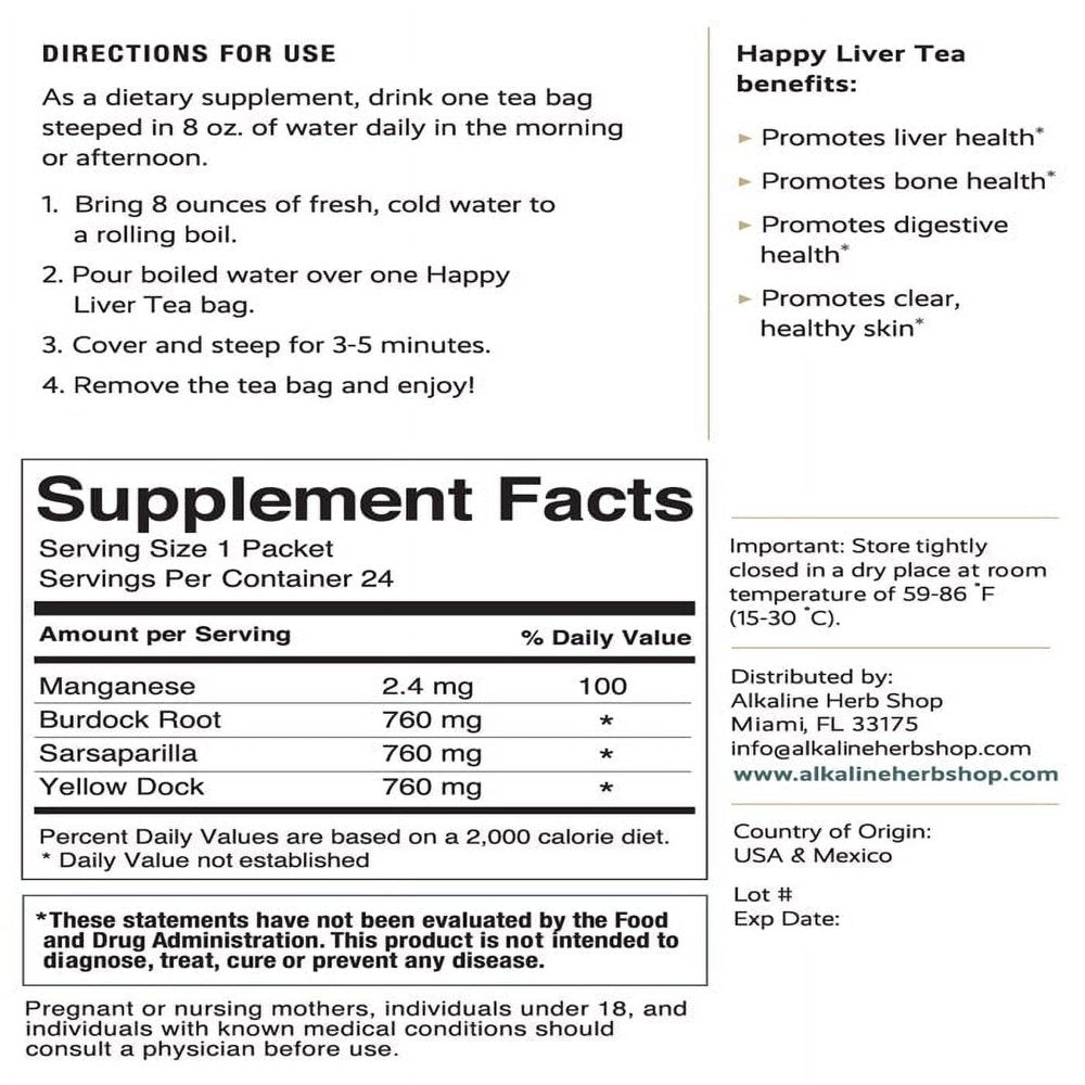 Promotes liver health* Promotes bone health* Promotes digestive health* Promotes clear, healthy skin* Each bag contains 24 tea bags and is made from wildcrafted and organic herbs. The ingredients are Burdock Root, Yellow Dock and Sarsaparilla. *Happy Liver Tea comes in unbleached tea bags Pregnant or nursing mothers, individuals under 18, and individuals with known medical conditions should consult a physician before use. *These statements have not been evaluated by the Food and Drug Administration. This product is not intended to diagnose, treat, cure, or prevent any disease.